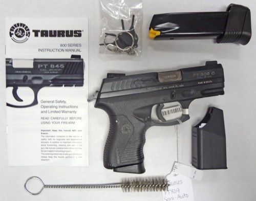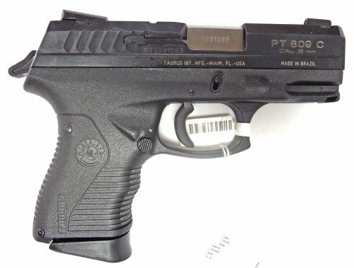 Taurus PT809 Compact Semi-Automatic Pistol. 9 mm. Action: double. Stock: polymer rame. Capacity: 12+1 and 17+1. # of magazines: 2. Safety: loaded chamber indicator, taurus security system. Sights: fixed. Overall length: 6.7". Weight: 24.7 oz. Features; ambidextrous magazine release, "strike two" trigger capability.