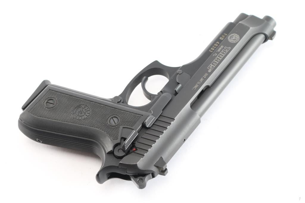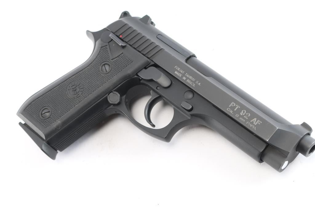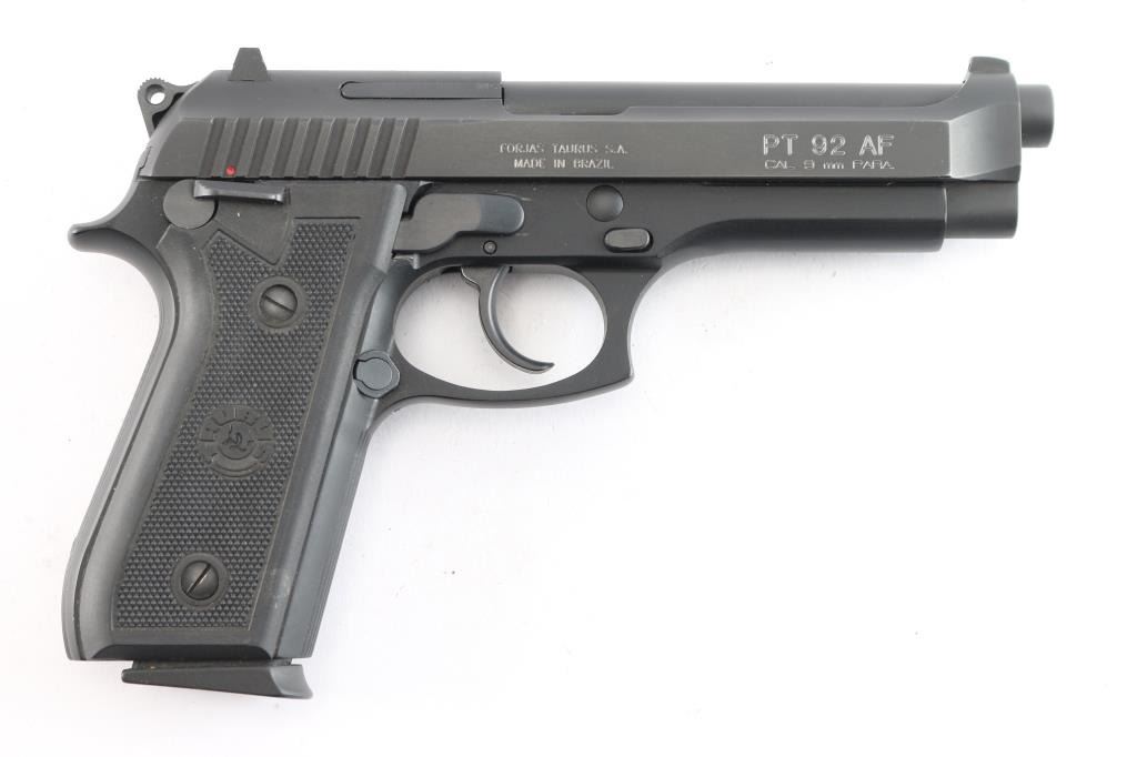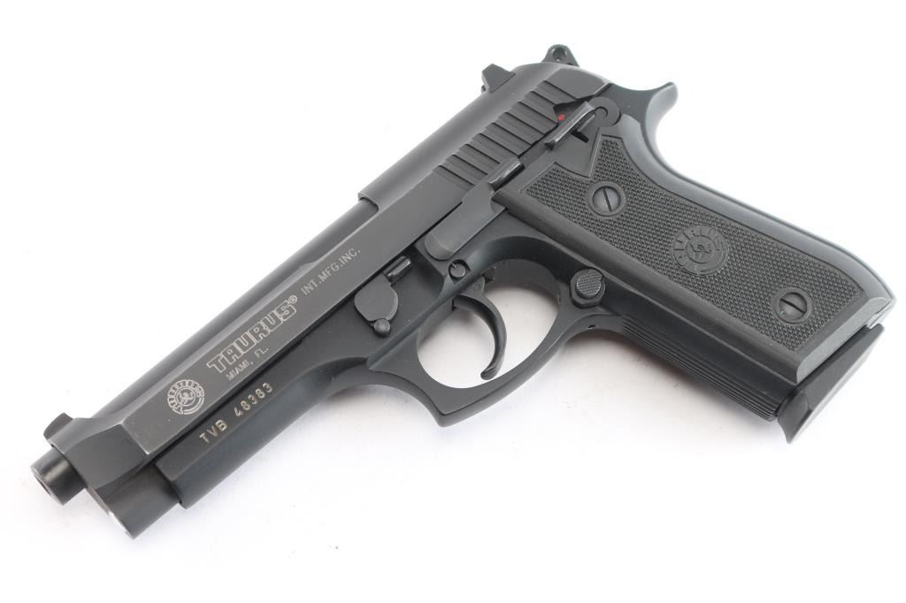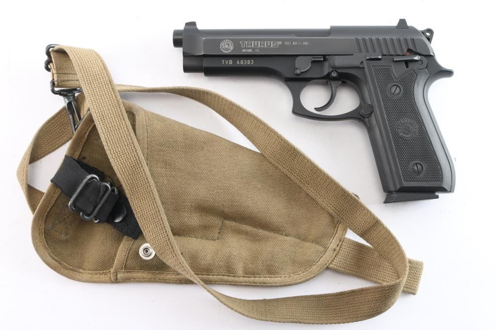 Brazilian made D.A. semi-automatic pistol, modeled after the Beretta 92. Matte black finish, 5" barrel, three-dot sights, aluminum frame, smooth trigger, one 10 rd. magazine, ambidextrous thumb safety and checkered polymer grips. Combat triggerguard, serrated grip straps. Includes tan web military style shoulder holster. The bore is very good/bright, strong rifling, finish is about 97% with minor edge wear, action is smooth and the grips are excellent.