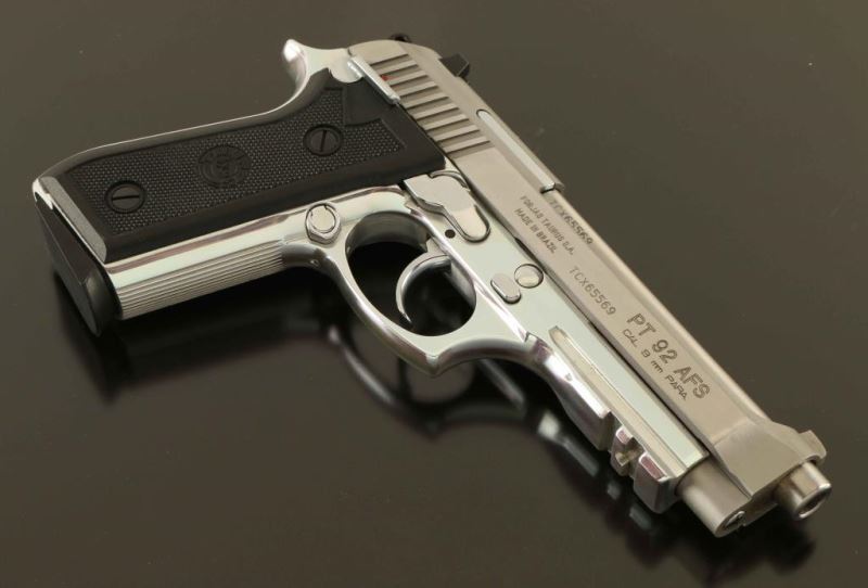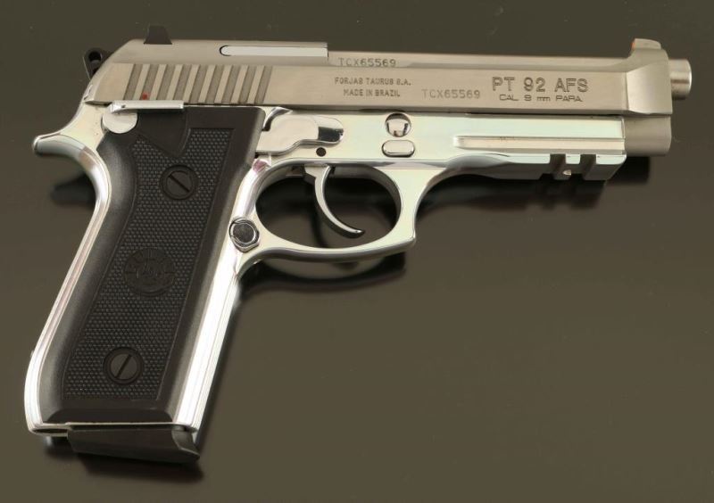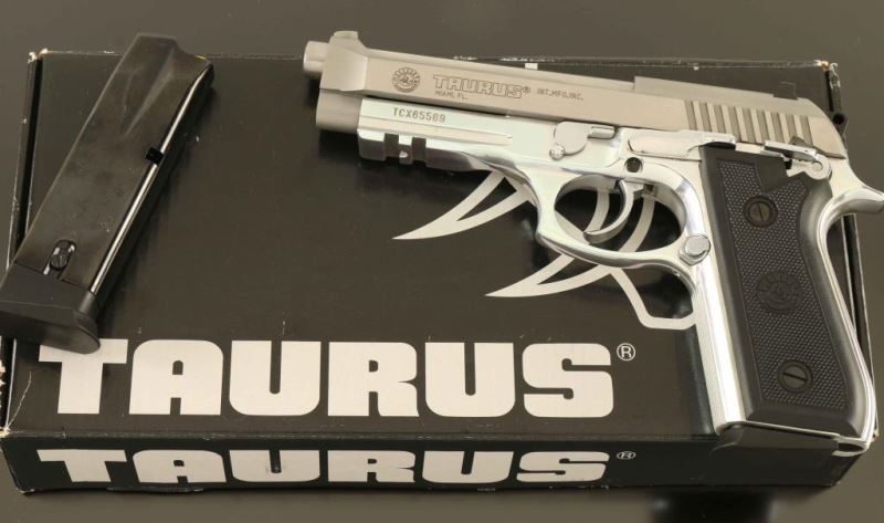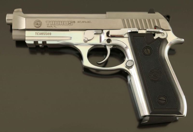 Brazilian made double action semi-automatic pistol based off the Beretta 92FS design and chambered in 9x19mm. Features a brushed/matte finished stainless steel slide, 5" barrel, fixed front sight with orange dot, dovetailed two-dot rear sight, smooth trigger, serrated round hammer spur, ambidextrous manual safety/decocker on the frame, internal locking safety, push button magazine release, 10 round magazine, polished aluminum frame with integral accessory rail and two-piece checkered black synthetic grips with Taurus insignias. Includes the original factory cardboard box with brush and spare magazine. Pistol exhibits light handling marks with no major wear observed. Action is smooth, the bore is excellent and the synthetic grips are fine. Condition is near NRA Perfect in box. ***Modern Firearm***