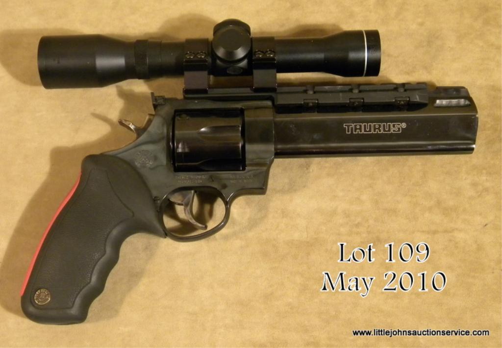 Taurus Raging Bull Model DA revolver, .44 Magnum cal., 6-1/2” barrel with built-in compensator, blue finish, finger groove Taurus combat hard rubber grips, #0448444. This gun is in overall excellent condition showing approx. 98% originalfinish with crisp action, excellent bore and very good grips. The gun is mounted with a Tasco 4 x 28 scope with adjustable Taurus Model 454 sight base. Est.: $400-$600.