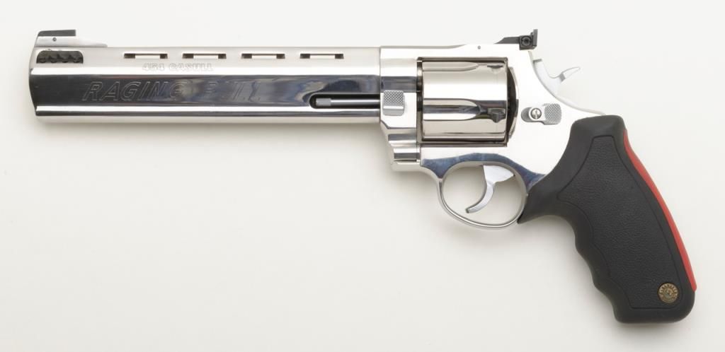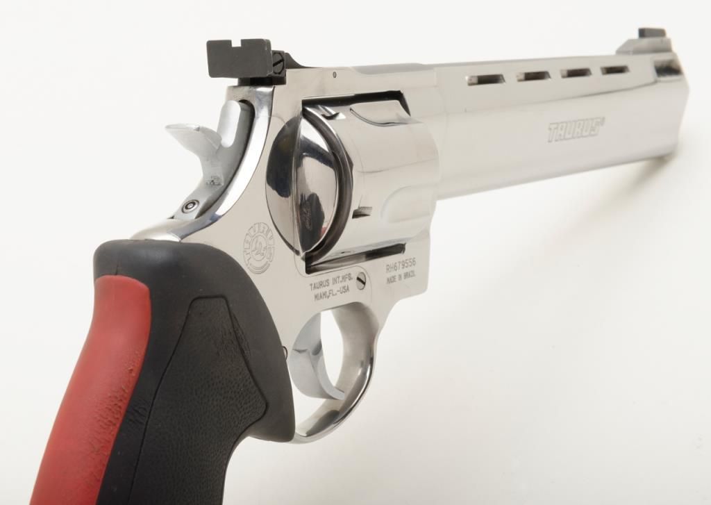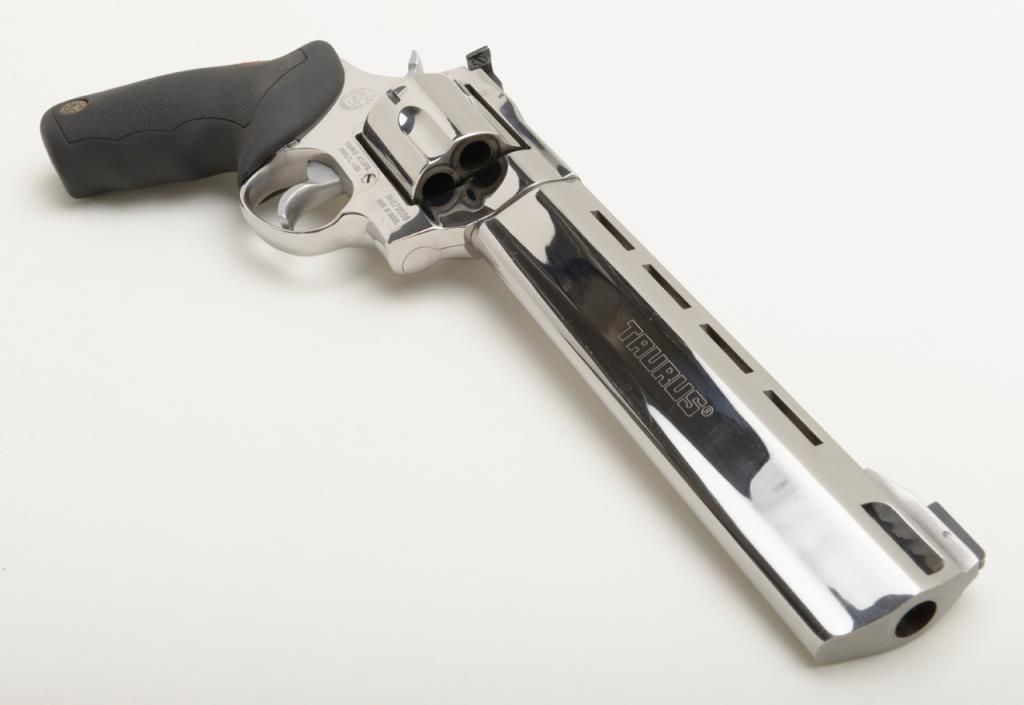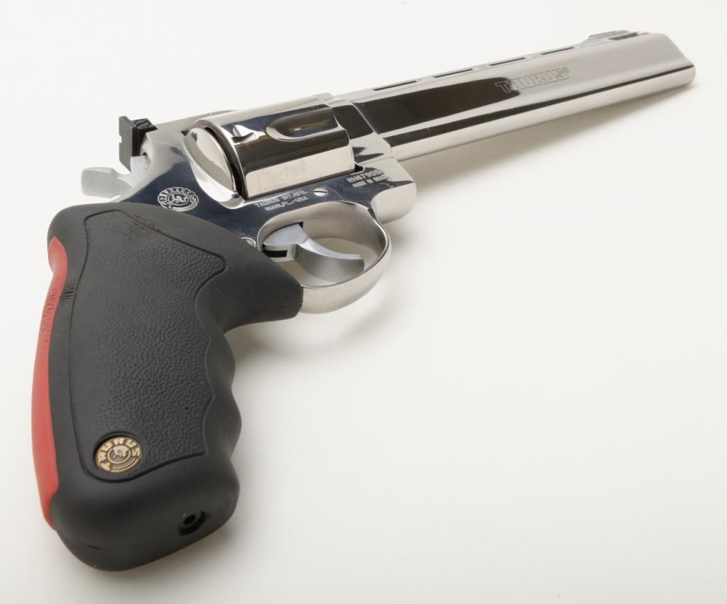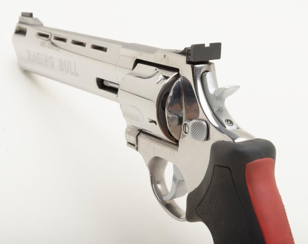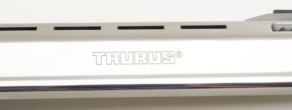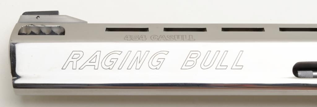 Taurus Raging Bull Model DA revolver, .454 Casull cal., 8-1/4” barrel, nickel finish, stippled finger groove rubber grips, #RH679556 in factory cardboard box with instructions . The gun is in overall fine condition with a fine bore, action, markings and grips. (Modern/PPT). Est.: $300-$600.