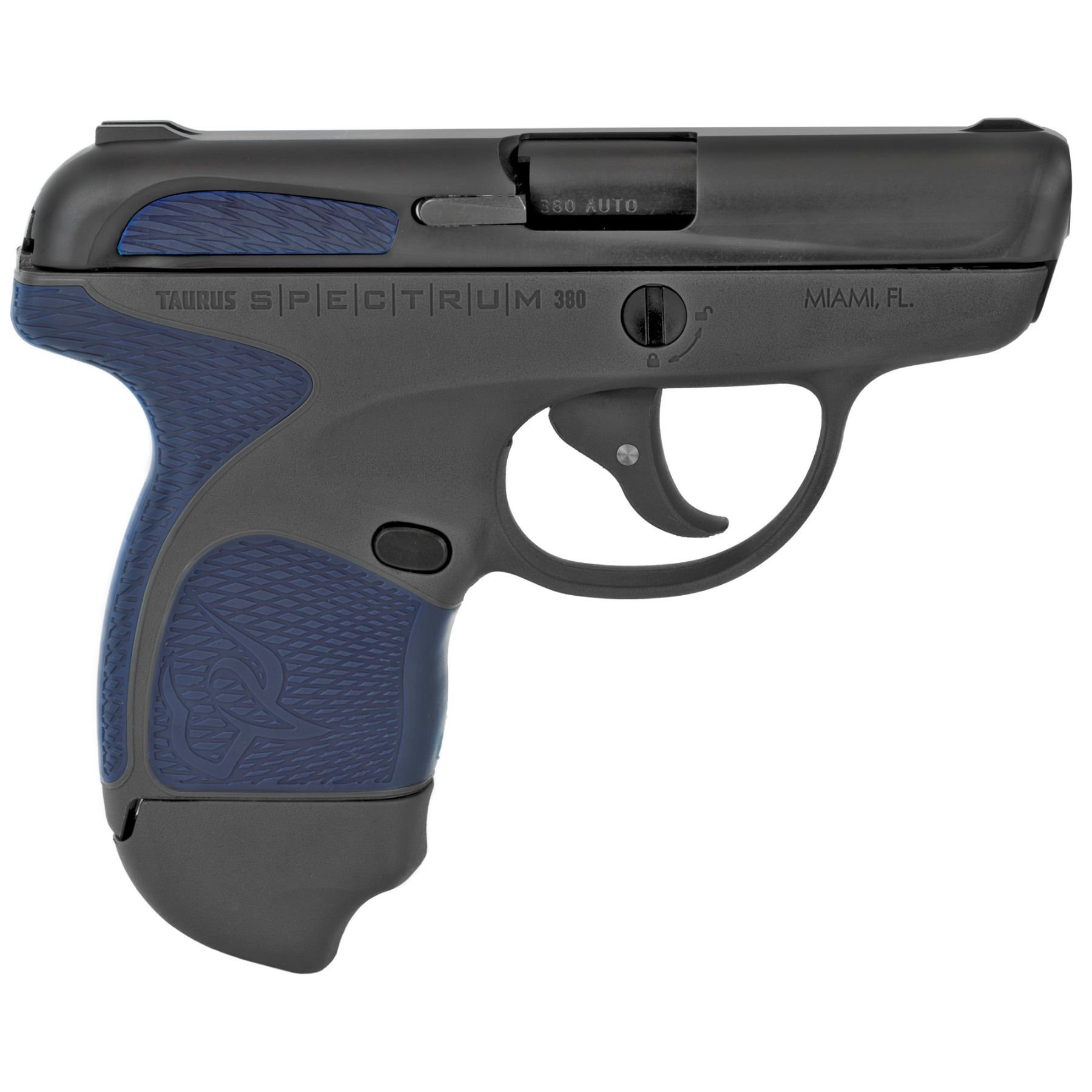 380ACP, 2.8" Barrel, Grey Polymer Frame, Indigo Blue Overmold, Black Slide, 1-6Rd & 1-7Rd, 2 Magazines