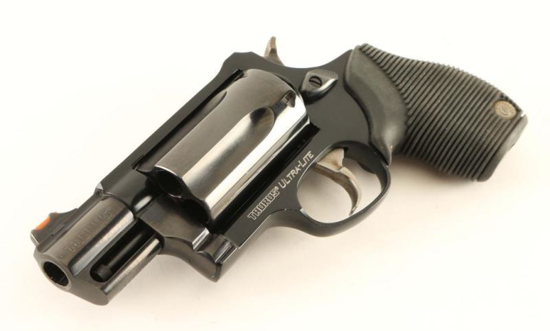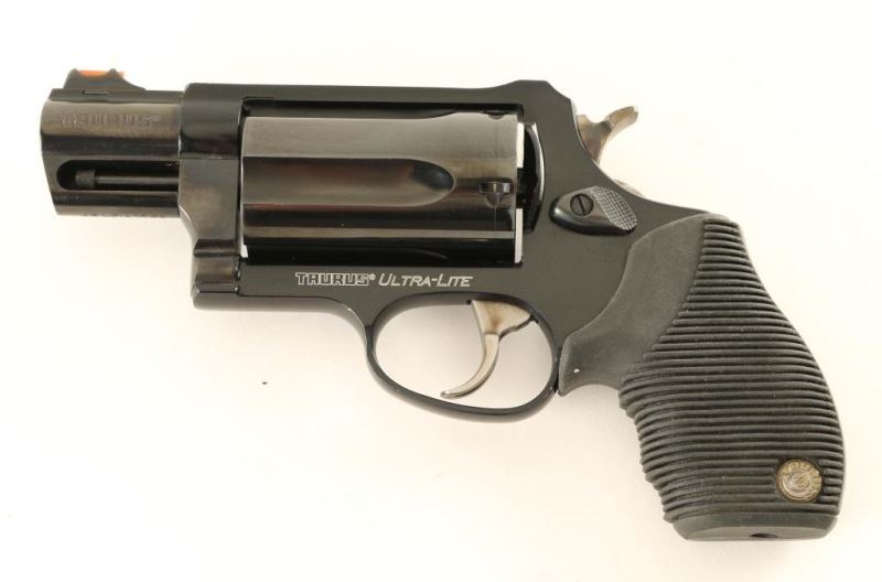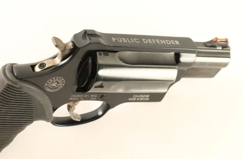 'Ultra-Lite Public Defender' Brazilian made lightweight small frame double-action revolver chambered for both .45 Colt & 2 1/2" 410 gauge shells. Features a blued 2" barrel, orange fiber optic front sight, channel cut rear sight, shrouded ejector rod, fluted five-shot cylinder, smooth case hardened trigger, case hardened hammer with checkered spur & internal locking safety, transfer bar safety, black finished aluminum frame and one-piece ribbed black rubber grip with Taurus medallions. Includes the original factory cardboard box. Revolver exhibits approximately 97% of it's original finish showing minor edge wear and a faint drag line on the cylinder. Action is smooth with good lock-up, bore is excellent and rubber grip is fine. Condition is NRA excellent in box. ***Modern Firearm***