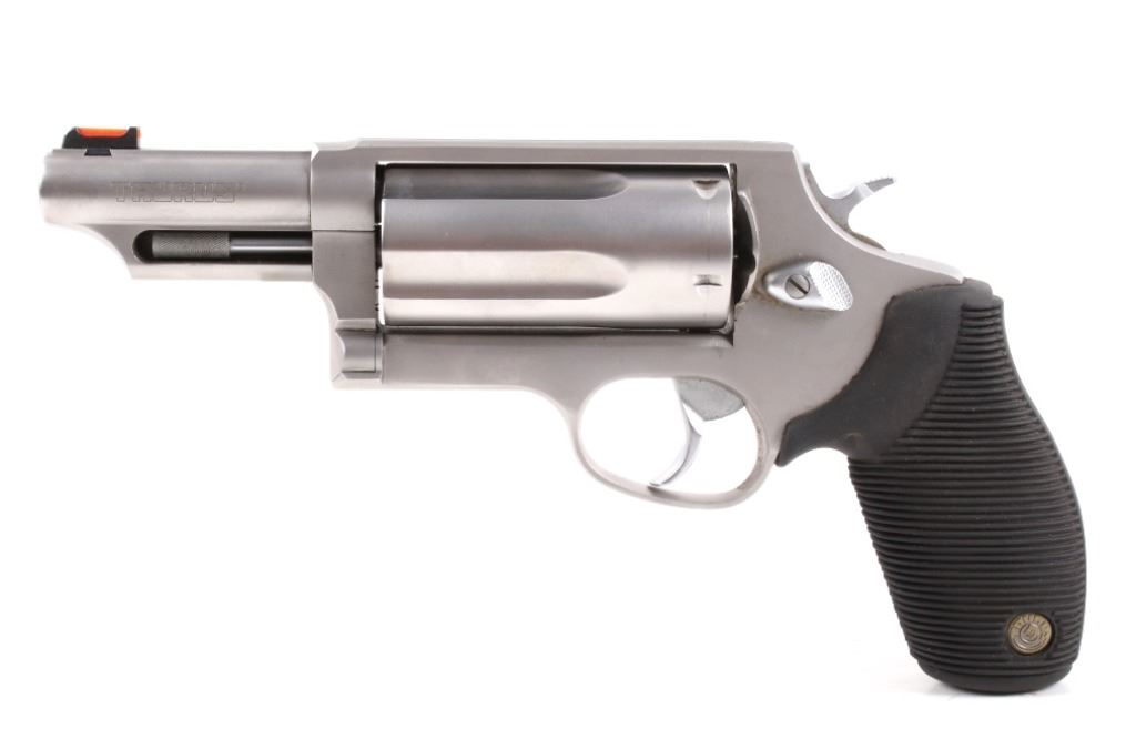 Included in this lot is a Taurus “The Judge” revolver chambered in .410 gauge, and .45 Long Colt caliber. The five shot, 3” barrel revolver is a great back country carry weapon allowing the user both short distance and long distance stopping power. The revolver can be loaded with a pistol and alternating shotgun shells. The firearm has a very good condition like new in the box mattes stainless silver finish with black rubber grips bearing the Taurus medallion. Top rail fixed sight with a high viz orange front sight. The underside of the barrel reads “.45LC/.410GA.” Serial Number: CS813752. This is a modern firearm and requires a FFL transfer or NICS background check.