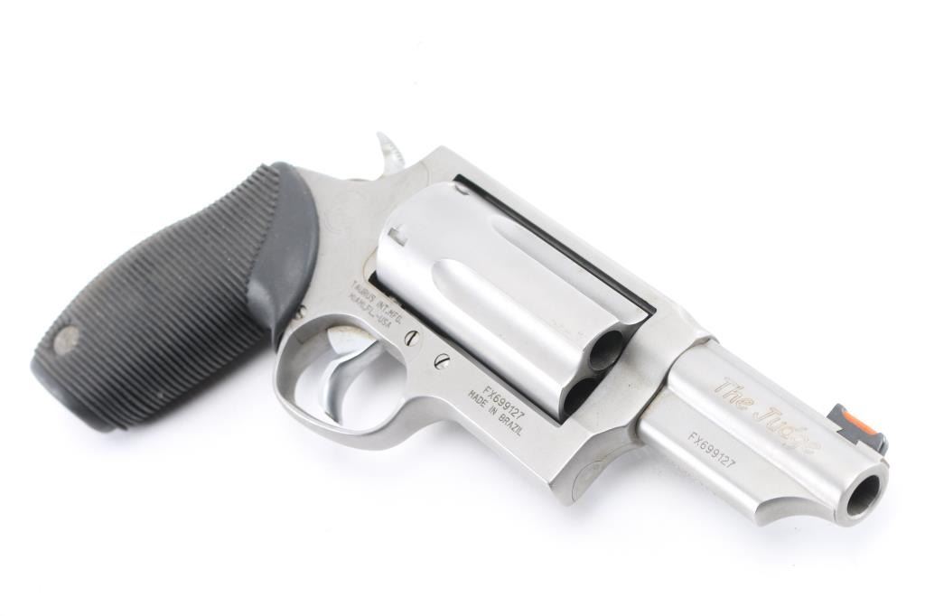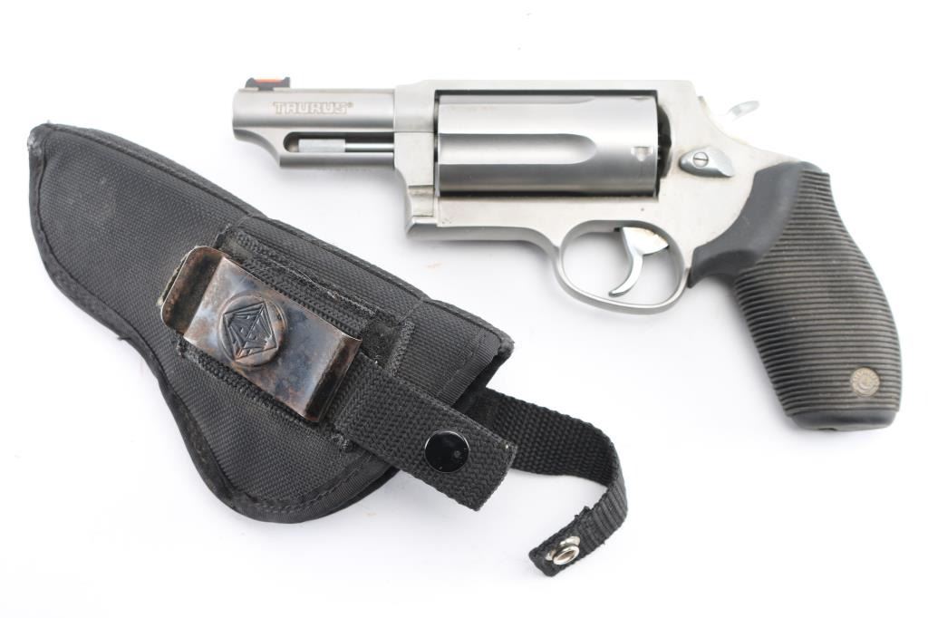 Brazilian made stainless steel double-action revolver chambered for .45 Colt or 3" .410 gauge shells. Features a satin finish, 3" barrel with a amber fiber optic front sight, square notched rear sight, shrouded ejector rod, fluted five-shot cylinder, smooth semi-target trigger, checkered semi-target hammer spur, integral locking safety and serrated black rubber grip with Taurus medallions. Revolver exhibits some light use showing a faunt drag ling and some light scratches/scuffs on the cylinder. Action is smooth with solid lock-up, bore appears excellent but dirty and rubber grip is fine. Gun is a little dirty overall. Comes with Double Triple nylon holster. Condition is NRA excellent. ***Modern Firearm***