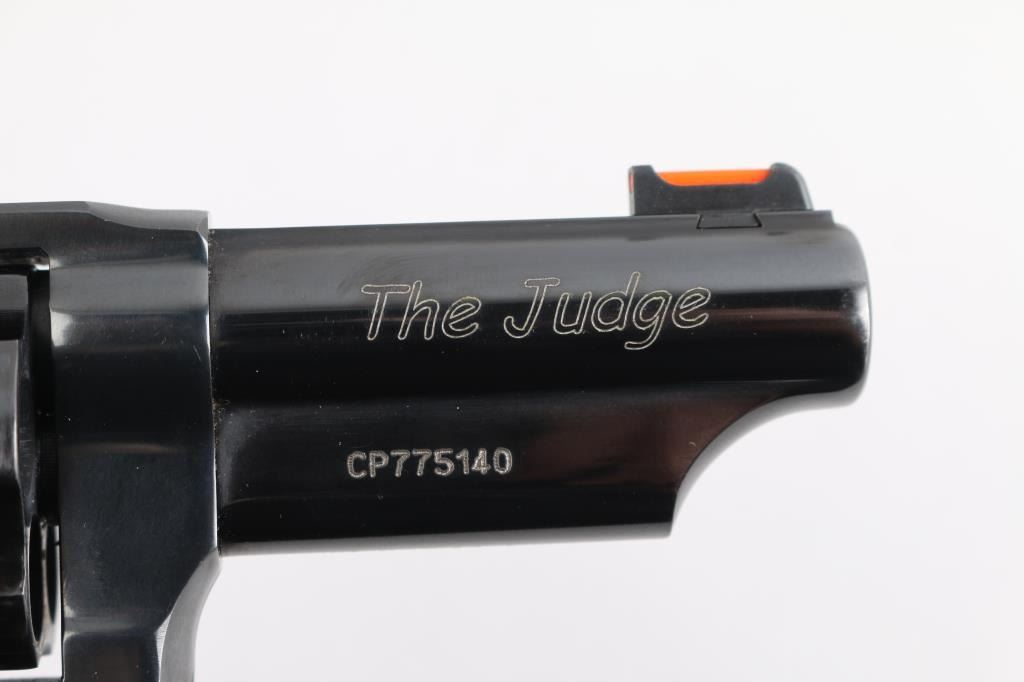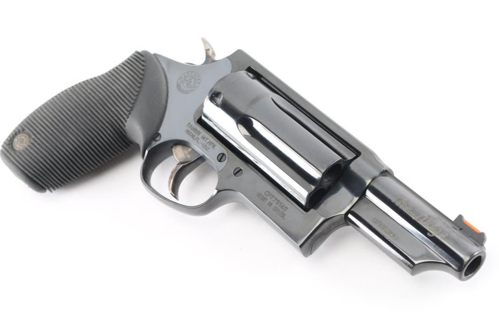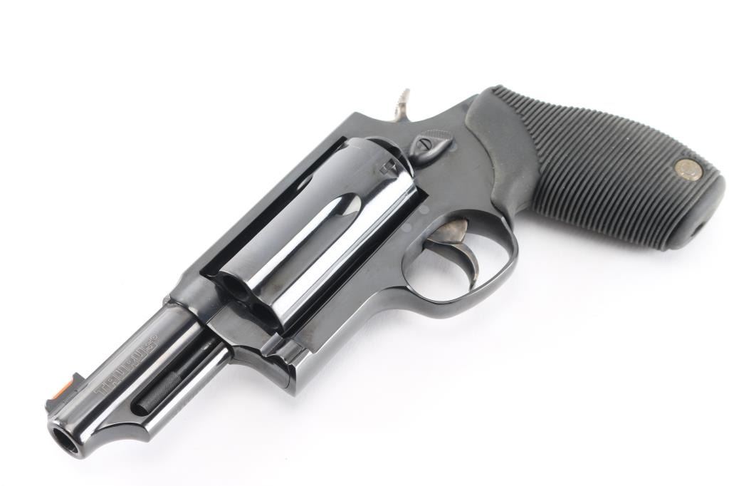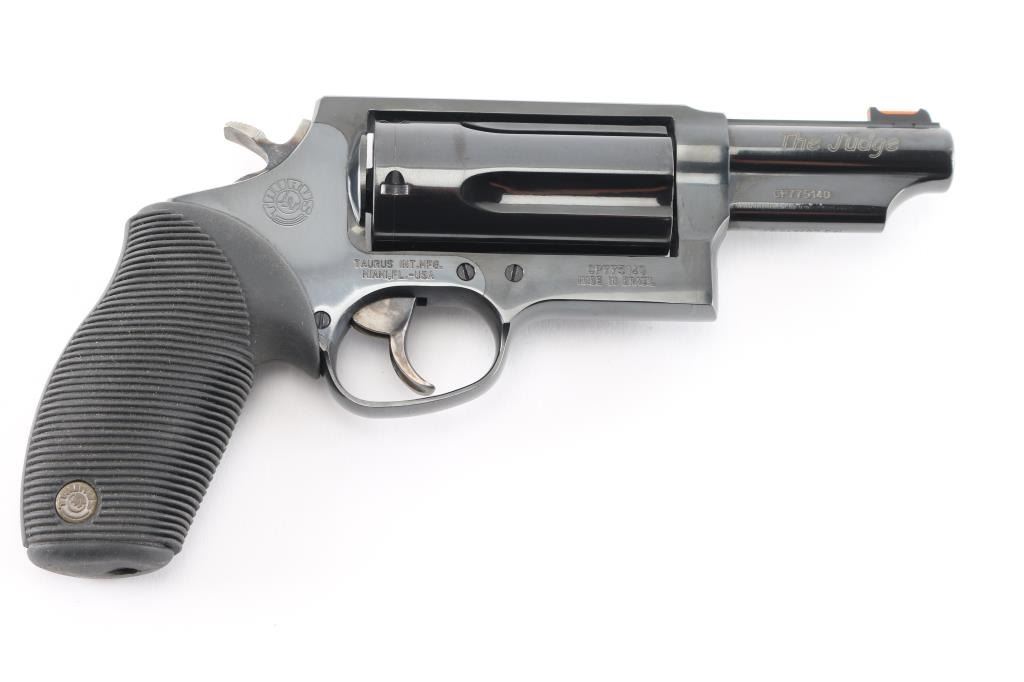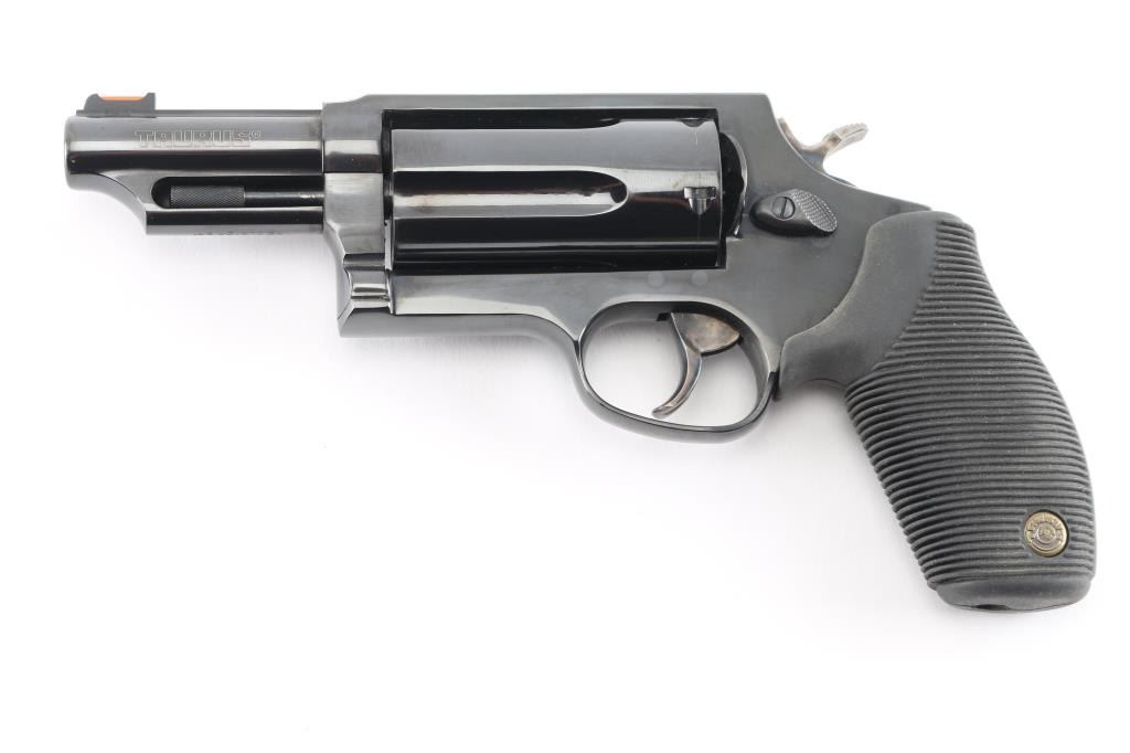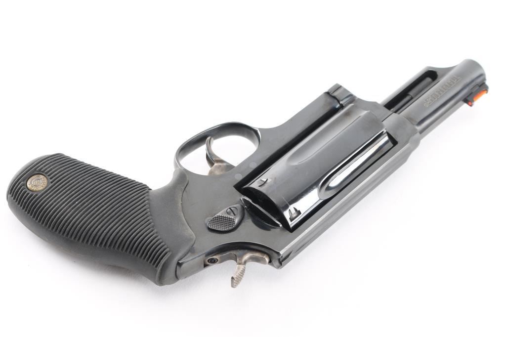 Brazilian made double action revolver chambered for both .45 Colt & .410 bore 3" shells. Features blue finish, case colored hammer and trigger, 3" barrel, orange fiber optic front sight, square channel cut rear sight, shrouded ejector rod, fluted five-shot cylinder, smooth trigger, knurled hammer spur, internal locking safety on the rear of the hammer, transfer bar safety, and one-piece ribbed black rubber grip with Taurus Medallions. Bore is excellent/bright, a little dirty. Retains 95% finish with slight muzzle wear, feint drag line on the cylinder. Smooth action with tight lock-up.Condition is NRA Near Excellent. Modern Firearm.