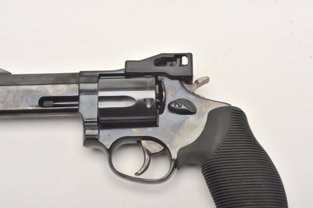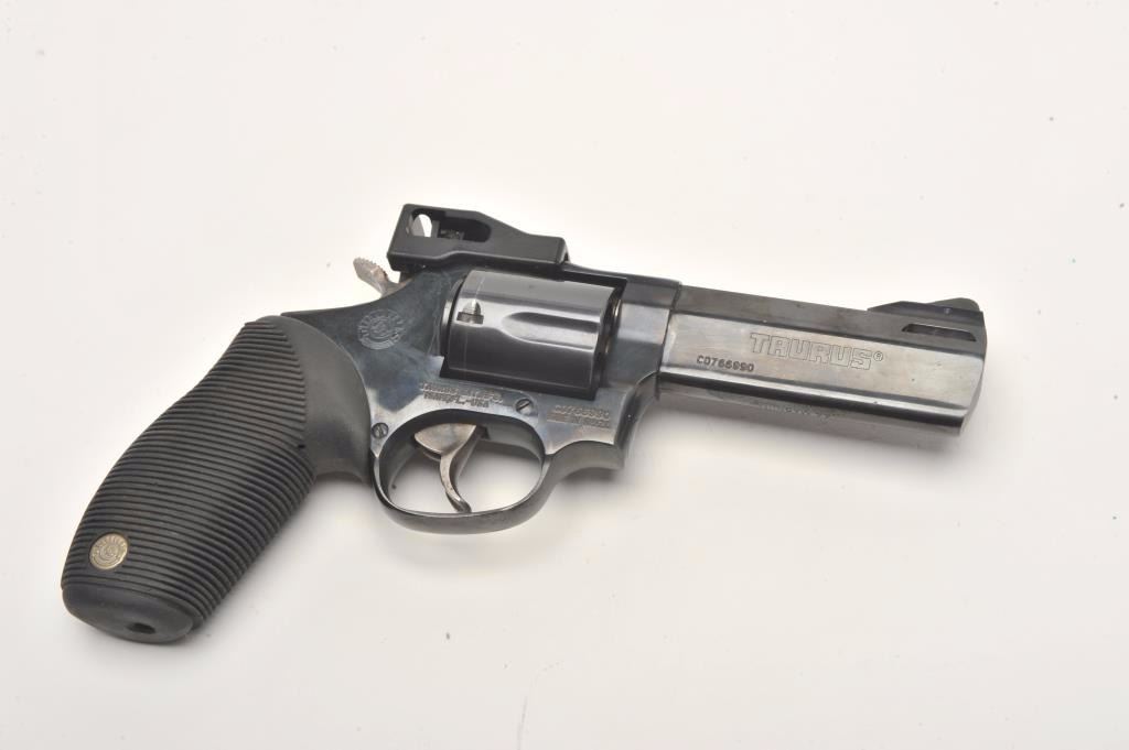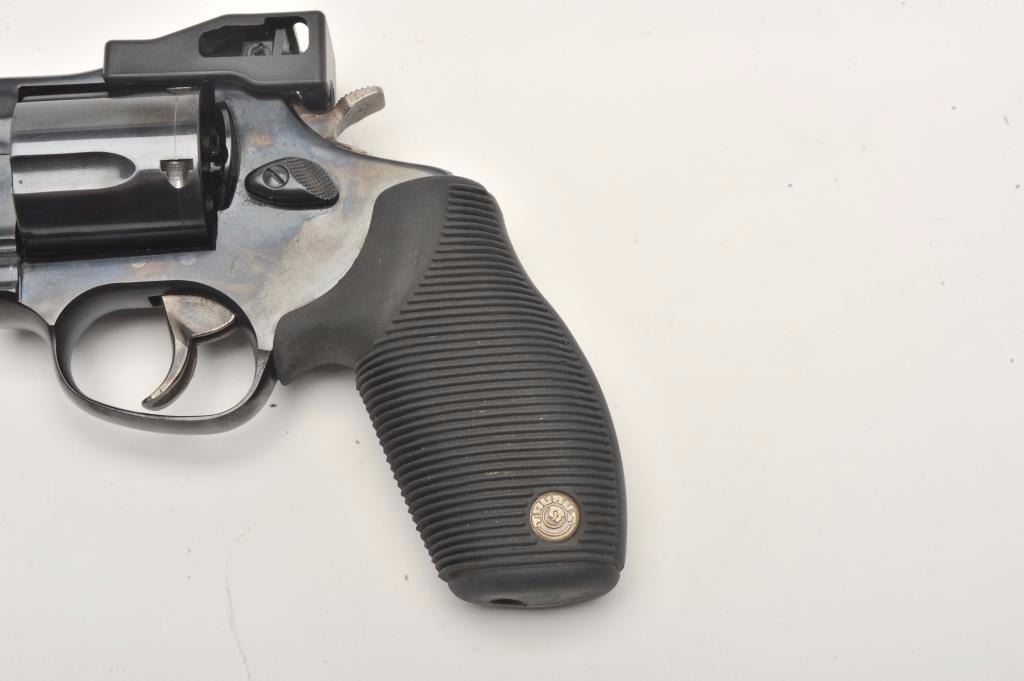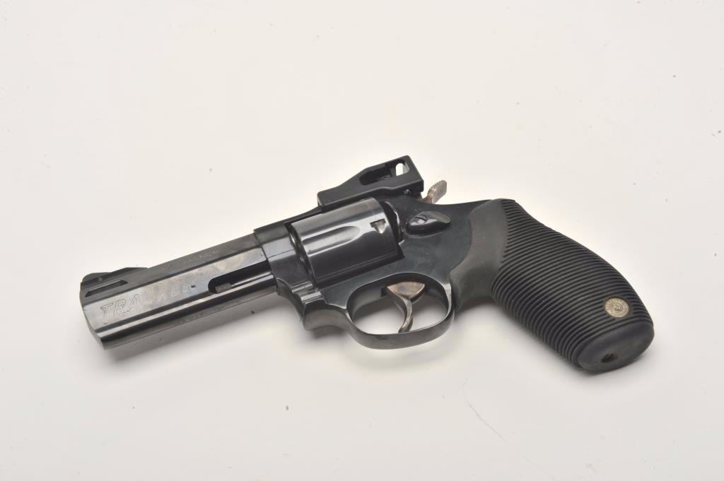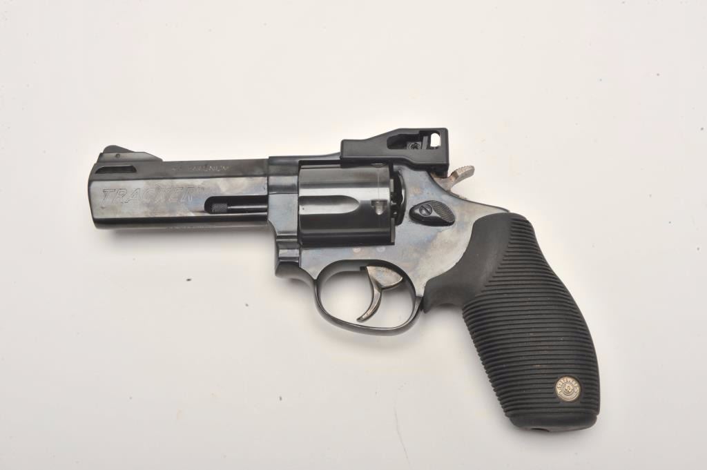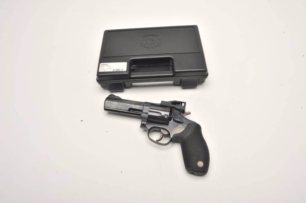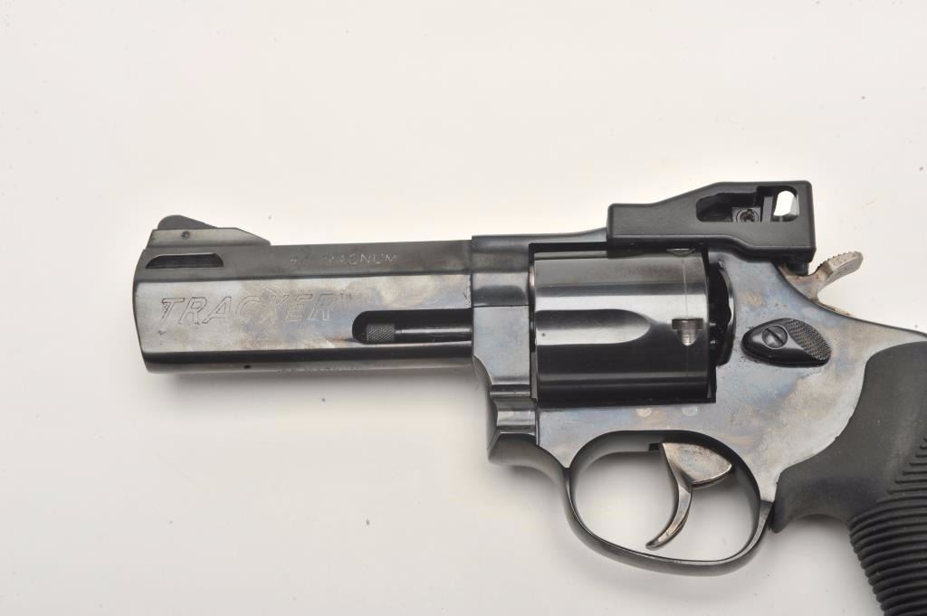 Taurus Tracker Model DA revolver, .44 Magnum caliber, 4” ported barrel, blued finish, hard rubber grips, S/N C0766990, in overall fine condition with crisp action, sharp markings, very good to fine bore and fine grips; withTaurus hard case and instructions. (Modern/NO CALIF SALE). Est.: $250-$500.