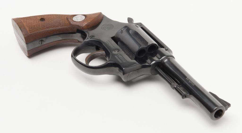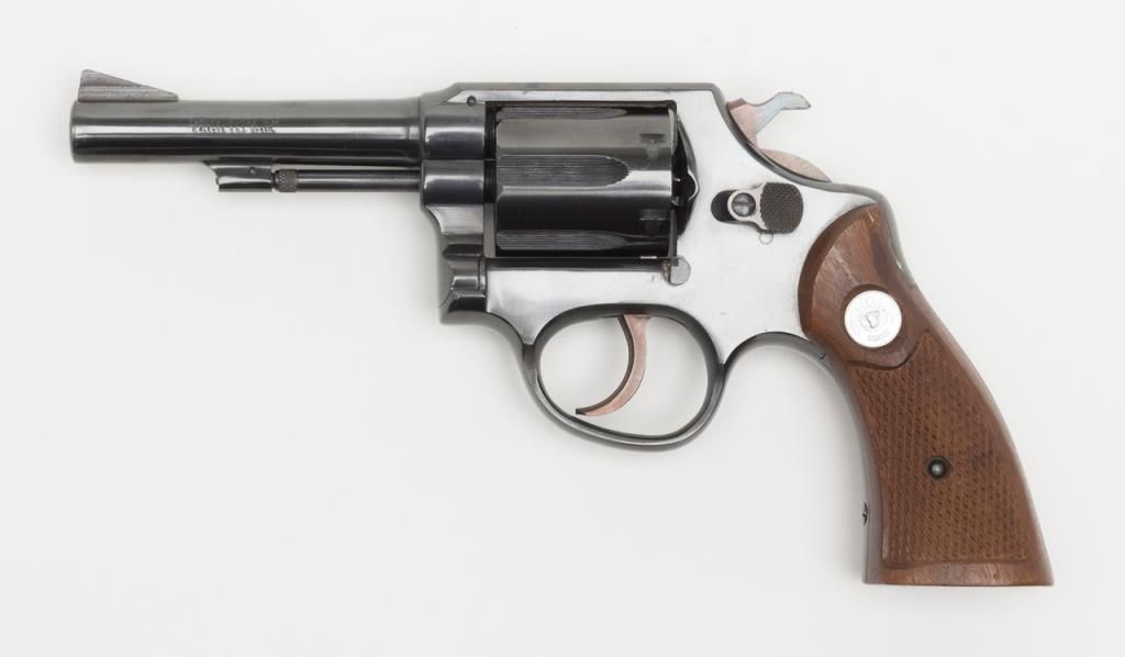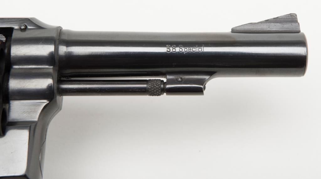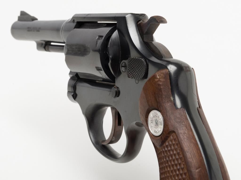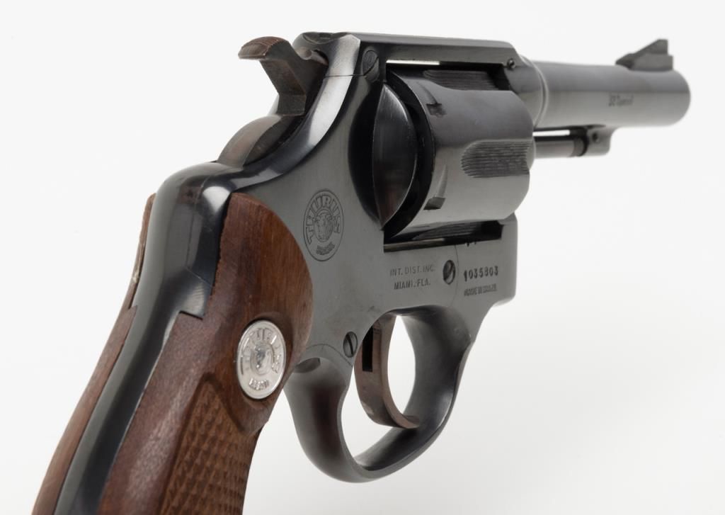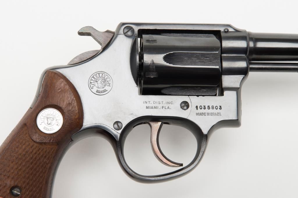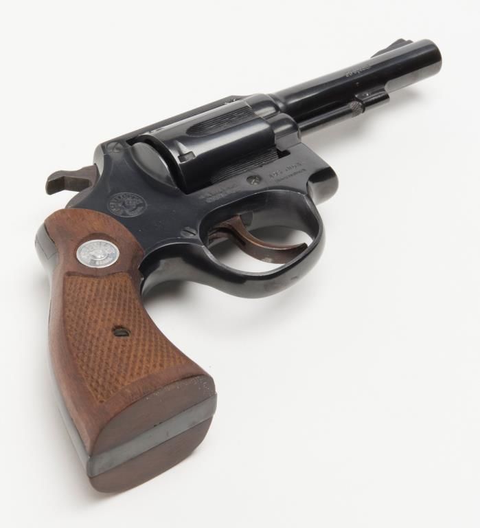 Taurus double action revolver, cal. .38 Special, Serial #1035803. The pistol is in overall very good to nearly fine condition with a 4” blued barrel. The pistol retains nearly all of its blued finish with a crisp action and sharpmarkings. The checkered wood medallion grips are in fine condition showing only minimal wear. The bore is very good, while the hammer and trigger show considerable muted case coloring. (Modern/PPT). Est.: $200-$300.
