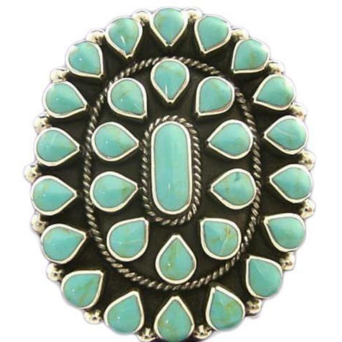 Taxco Mexican Sterling Silver Ring with 28 ( 4 x 5mm ) pear-shaped inlaid turquoise & 1 oval ( 4 x 10mm ) inlaid turquoise pieces. Adjustable size band. Extra-large ring face - 1 3/4" X 1 1/2". Stamped 925 inside band. Size 7.5 - 8 adjustable band.