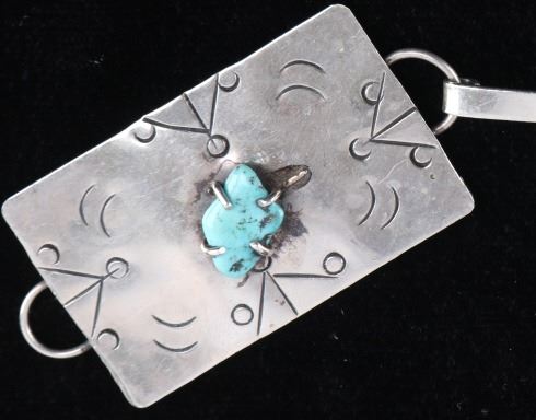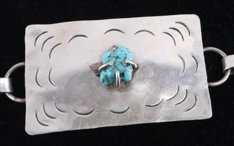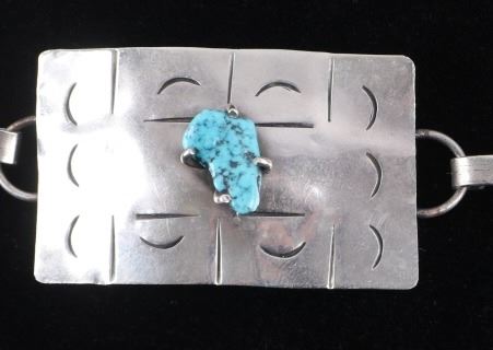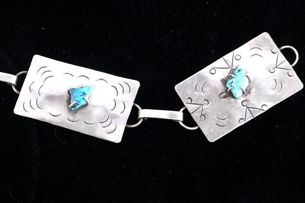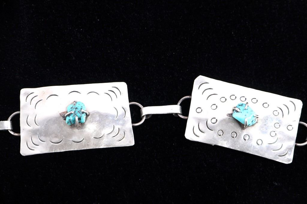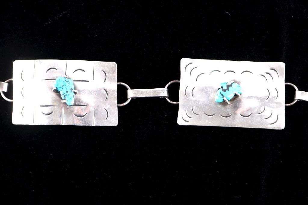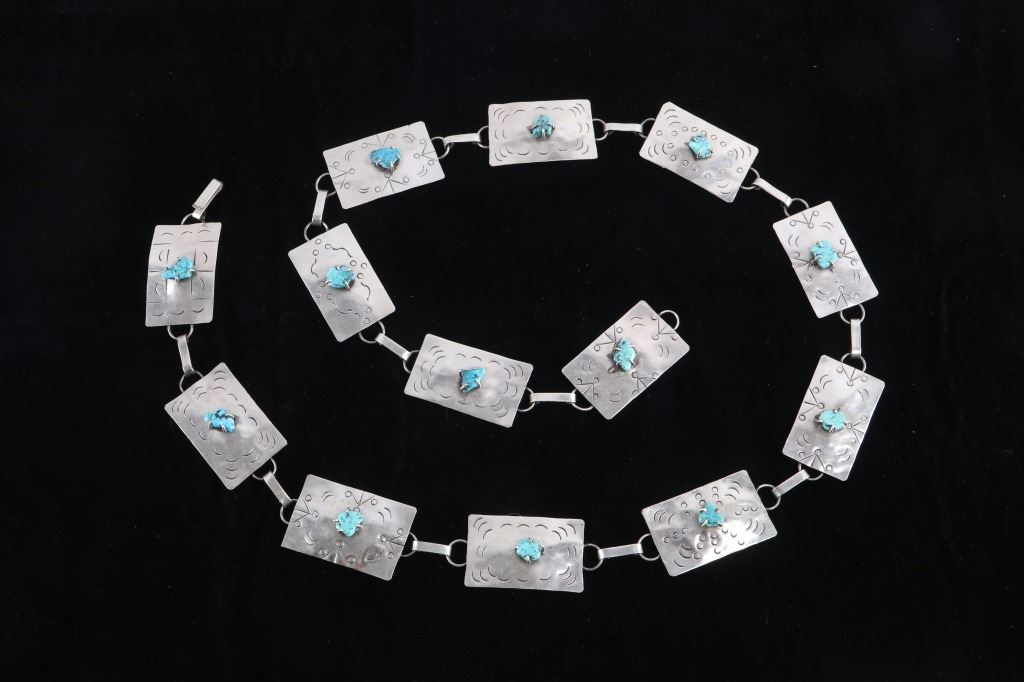 Featured in this lot is this Taxco, Mexico silver and turquoise nugget concho belt, circa 1940's. This concho belt consists of 13 total silver conchos with stamped geometric patterns adorning the faces of the conchos and 13 four prong set turquoise nuggets into the center of the conchos. The condition of this belt is good, with patina consistent with age. The measurements of this concho belt are 40" and each concho measures 1 1/4" x 2" x 1/4". The collective weight of this belt is 131 g.