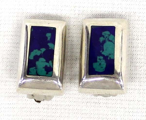 Vintage Taxco Sterling Azurite Malachite Clip-On Earrings, marked TF-76 Mexico .925, measure 1'' x .75''