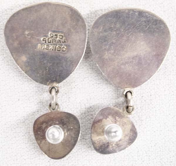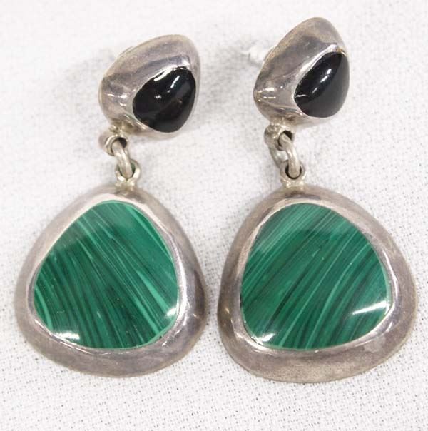 Taxco Sterling Silver Malachite and Jet Earrings, measure 2''L x 1''W, hallmarked, 19.81g in total wt.