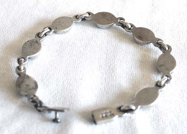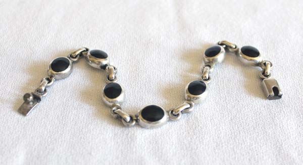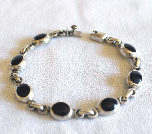 Taxco Sterling Silver Onyx Bracelet, measures 8'' end to end x 5/16''W, nice link sterling silver bracelet set with black onyx cabochons, features 7 onyx and silver links, envelope clasp closure, 28.63g in total wt.