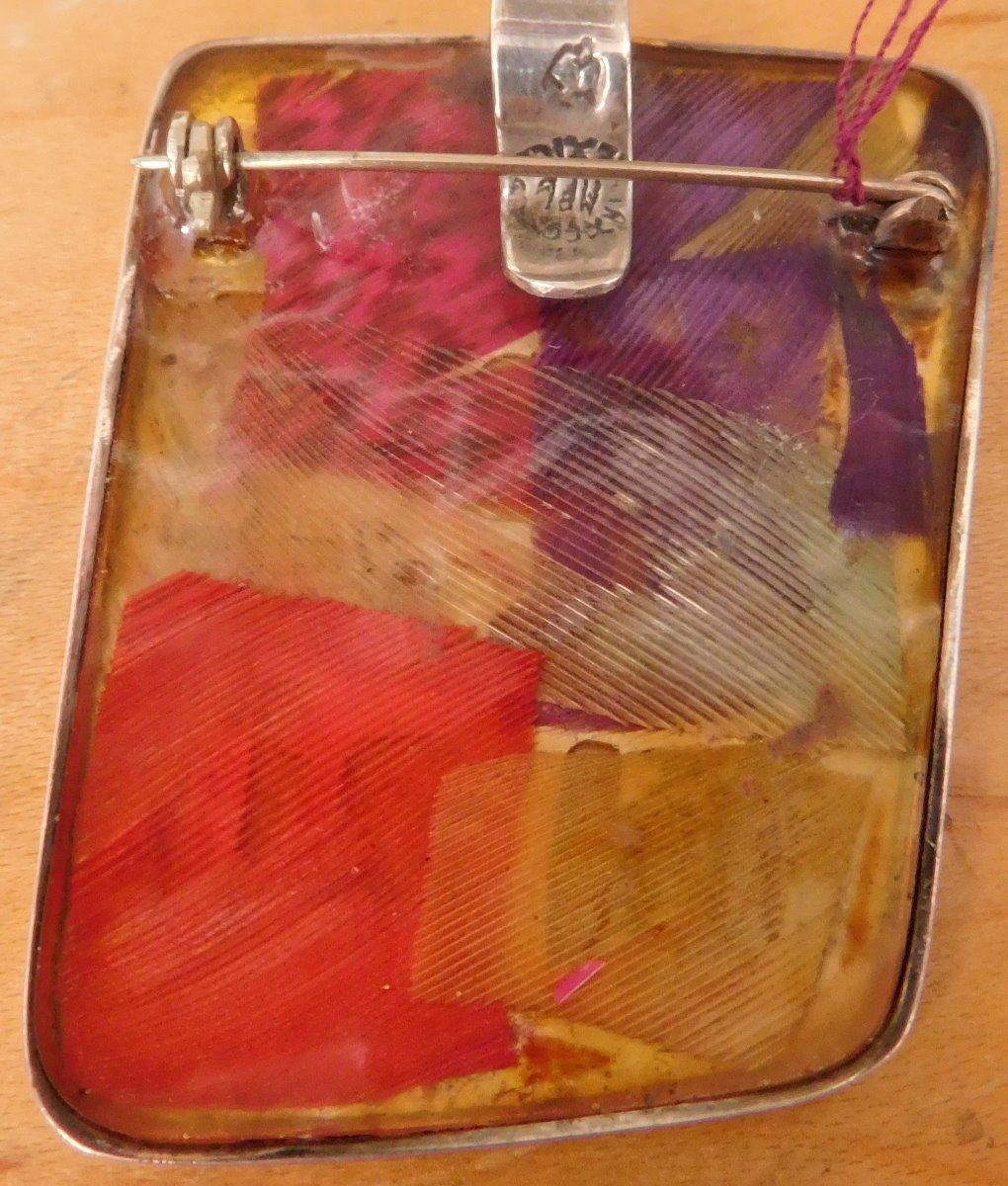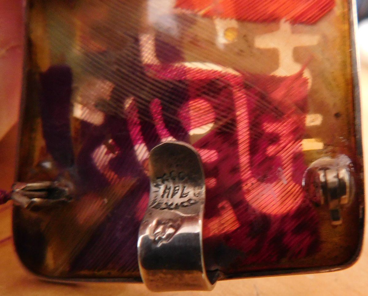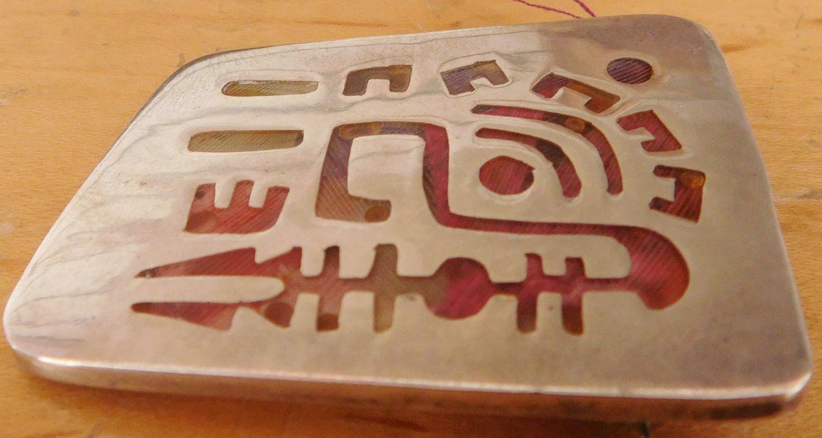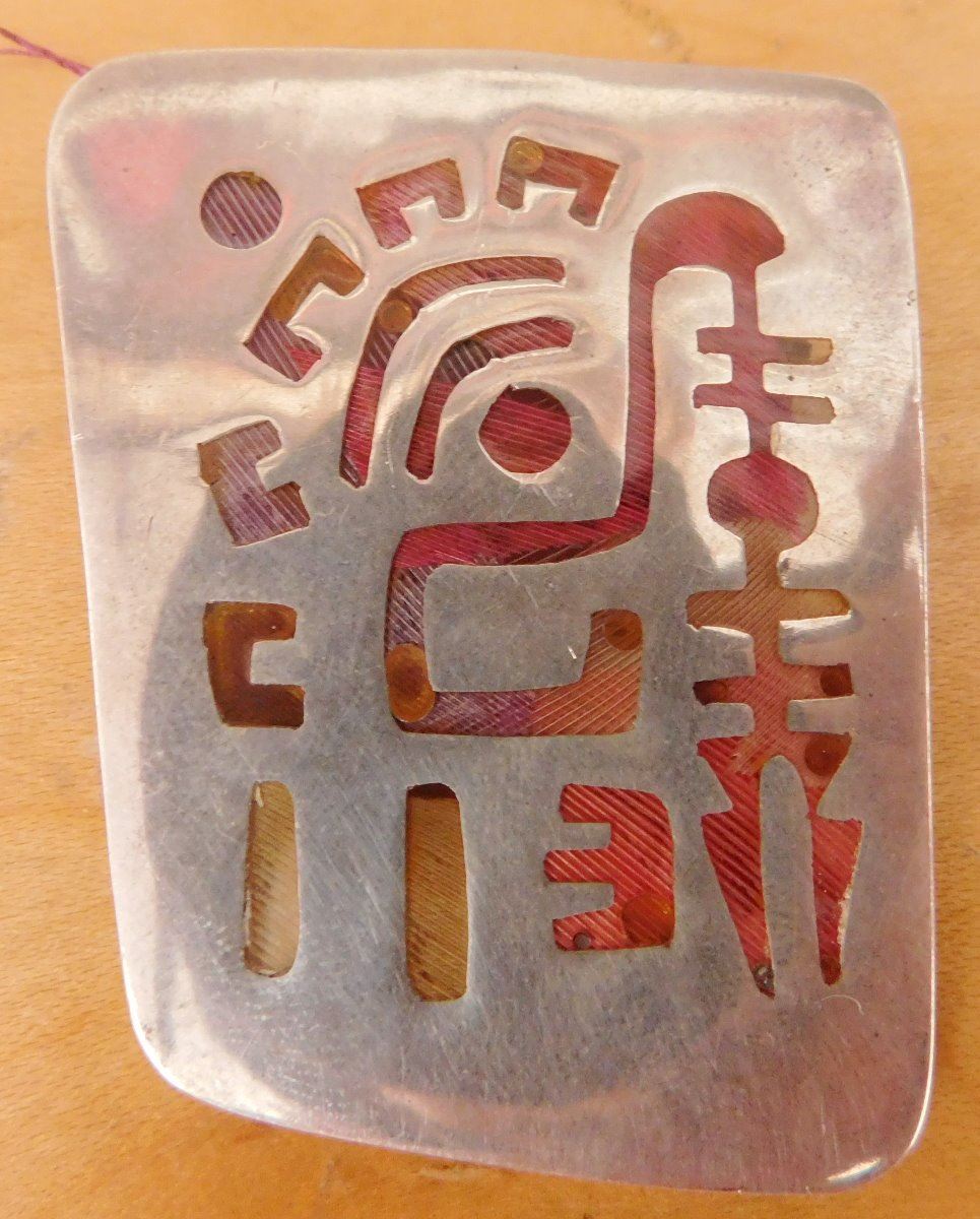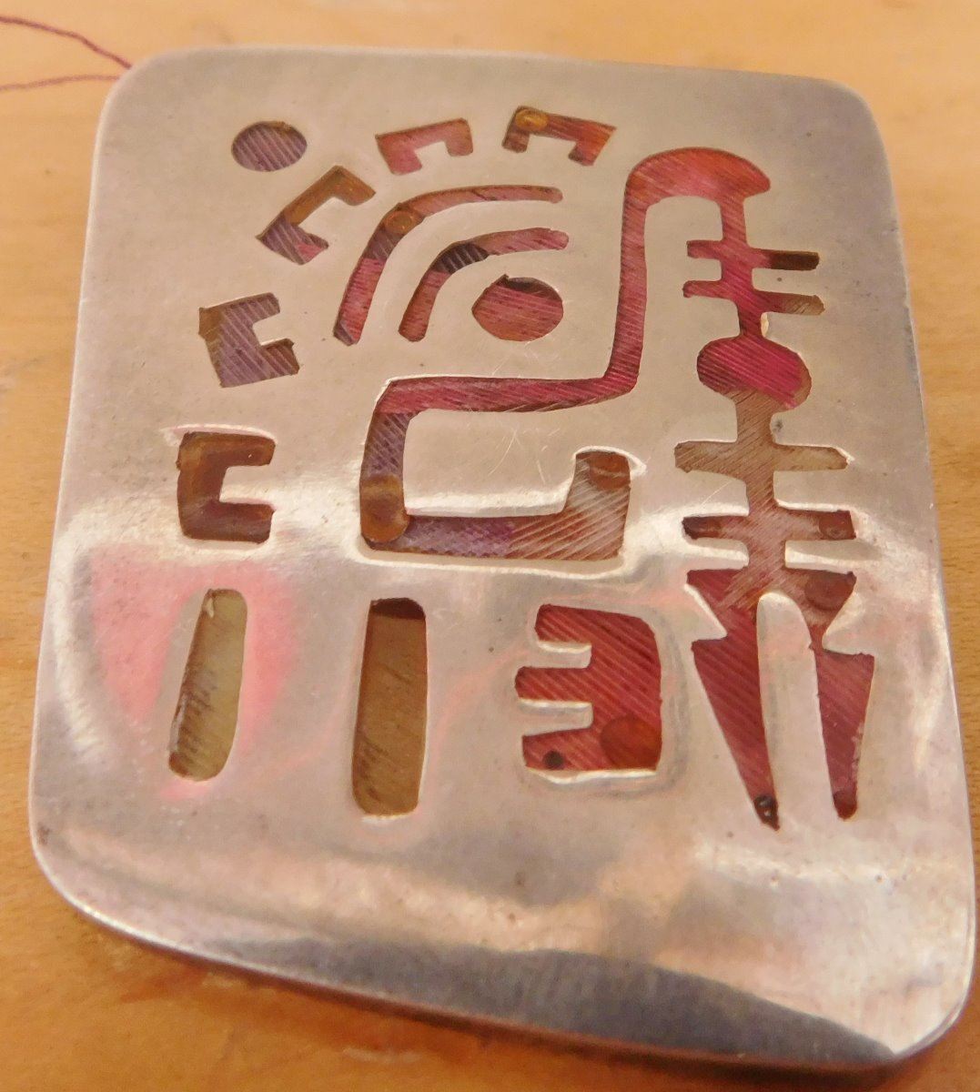 Taxco Sterling Silver Pin, circa 1960s. Made of sterling silver and resin, the item measures 1.75" x 2" and weighs 15 grams. Taxco, Mexico. Nice pre-columbian motif design. Condition: Very nice, see images. Shipping: $14.50 w/insurance and signature.