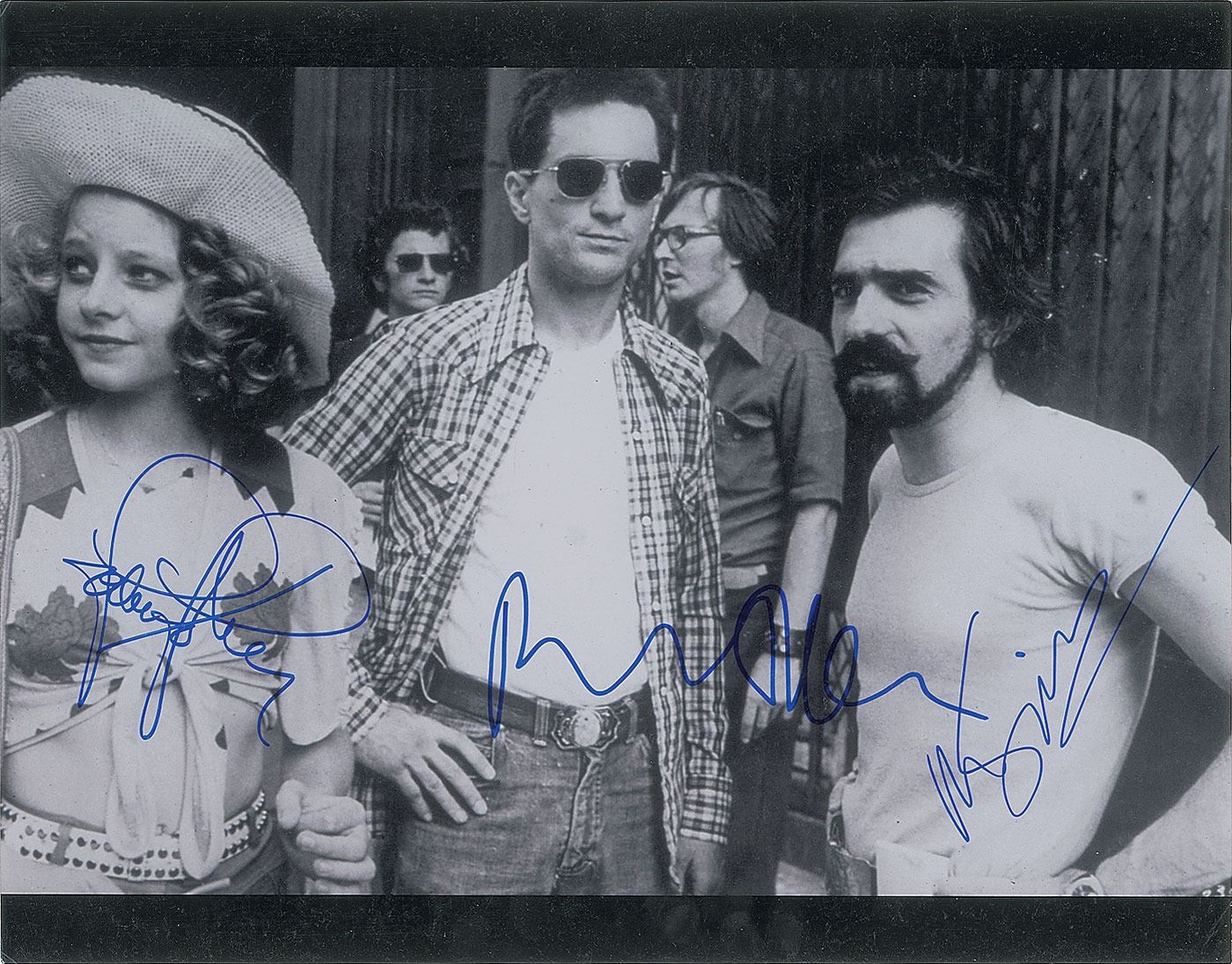 Glossy 14 x 11 photo of Robert De Niro, Jodie Foster and Martin Scorsese behind the scenes of the 1976 film Taxi Driver, with each signing in blue felt tip. In fine condition, with scattered creasing and surface scuffs.
