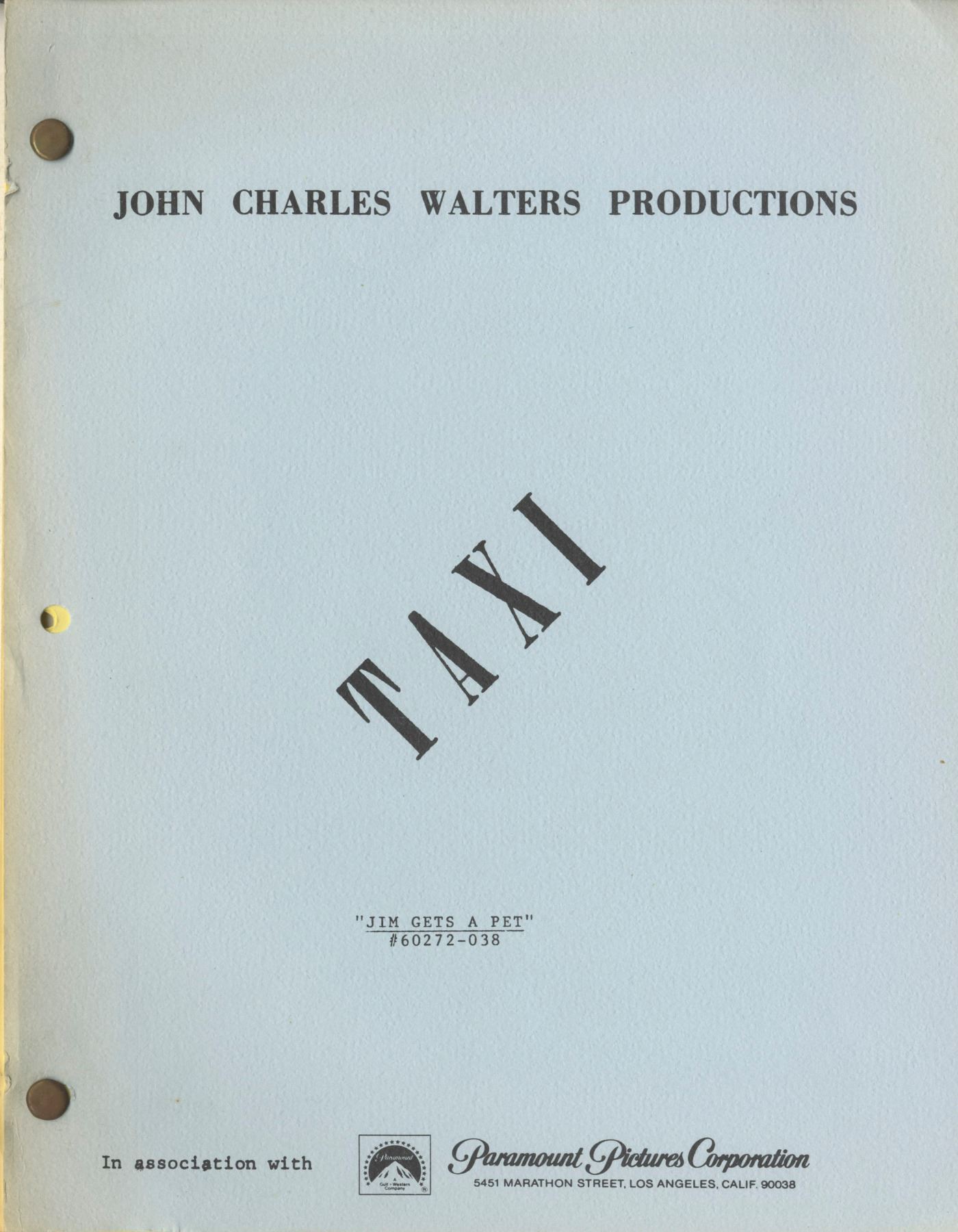 Script from the hit television show ''Taxi'' for episode 14 in season 2, ''Jim Gets a Pet''. 33pp. script on yellow paper with a pale blue cover credits David Lloyd as the writer, with ''FINAL DRAFT / November 27, 1979'' listed. Script was originally owned by Sam Simon, co-creator of ''The Simpsons'' and writer on ''Taxi''. Measure 8.5'' x 11''. Missing center brad, overall very good condition.