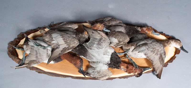 Five taxidermied ducks attached to wood tree panel with bark. 45" L, all ducks with feather loss.