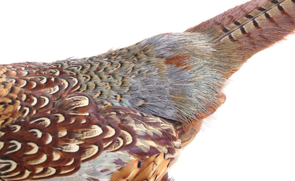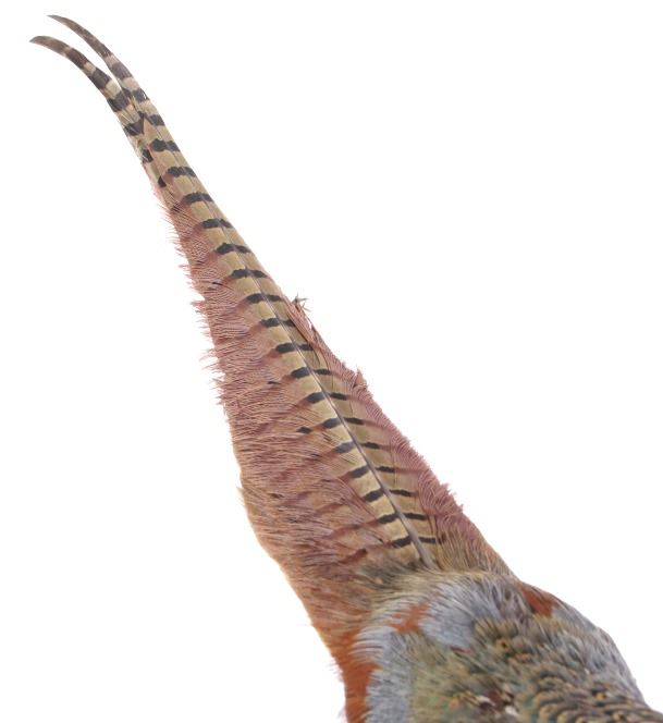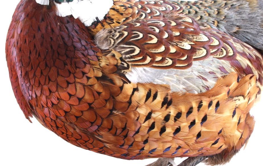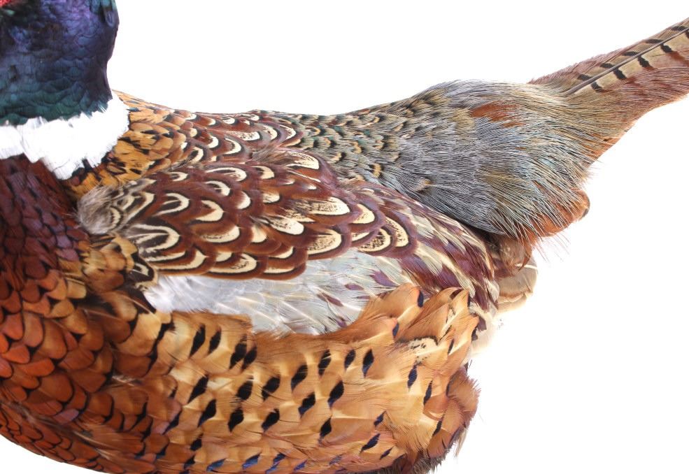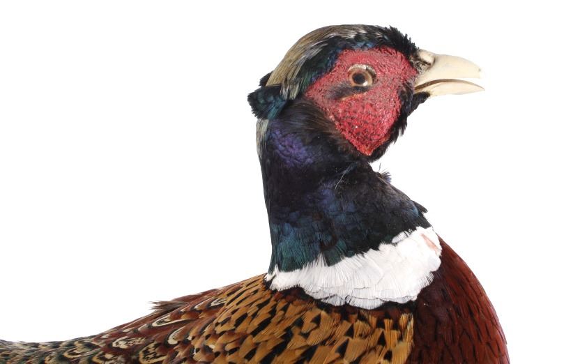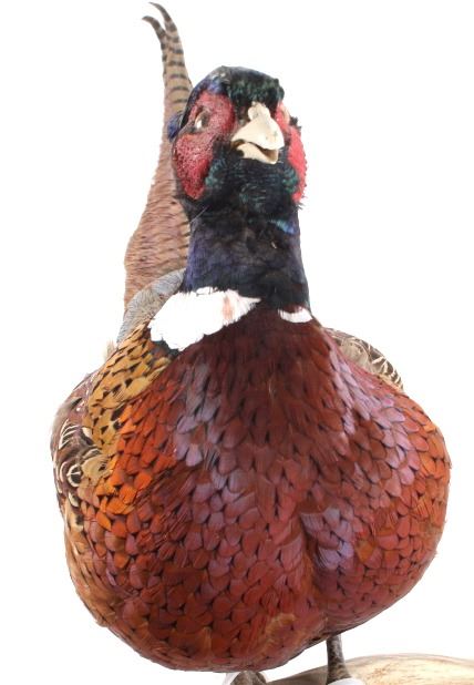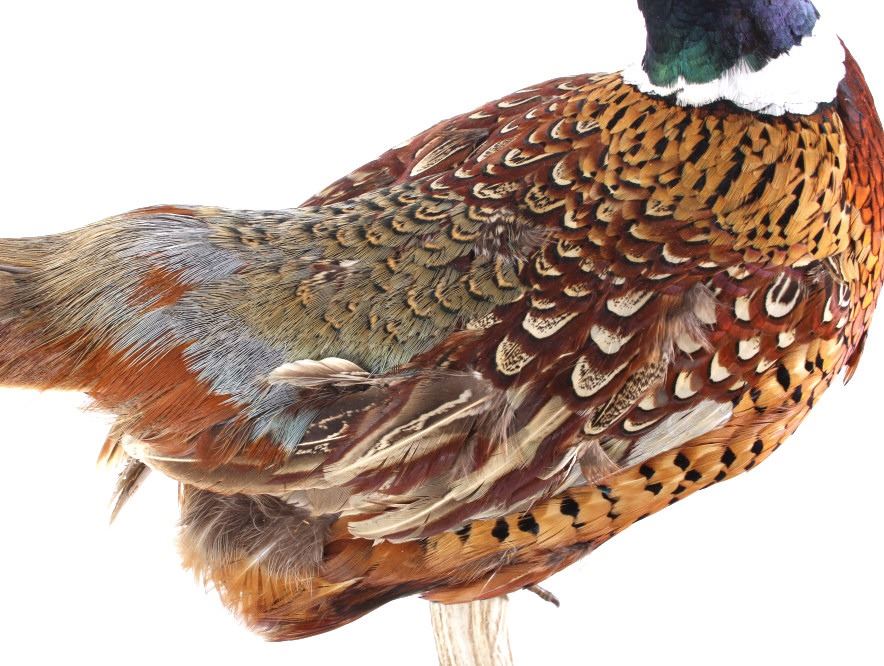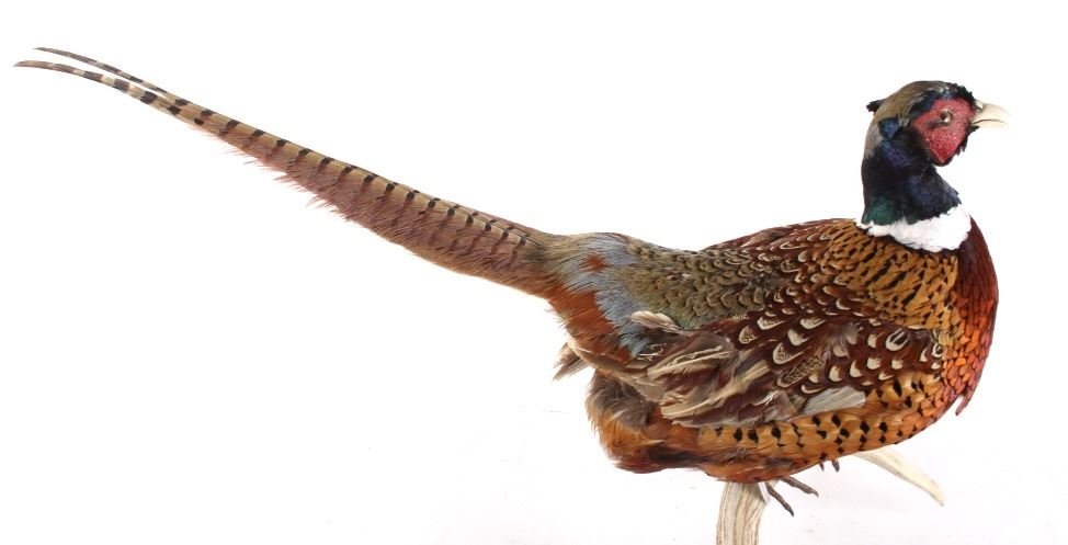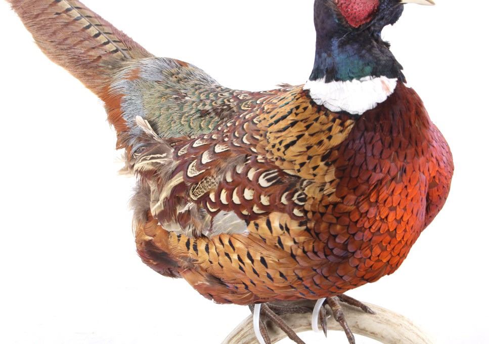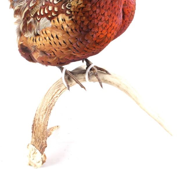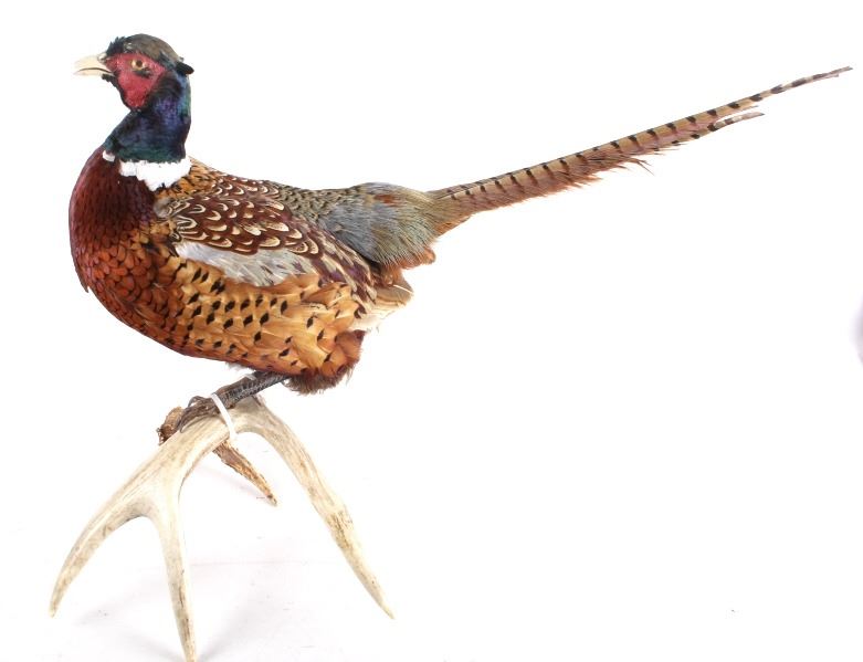 This lot features a stunning taxidermy pheasant mount. The bird is mounted on an antler. The mount was prepared and built by a professional taxidermist. The mount still ha vibrant feathers and does not appear to be experiencing shedding. The piece is in good condition for its age. Measures: 29" W x 12" D x 12" H