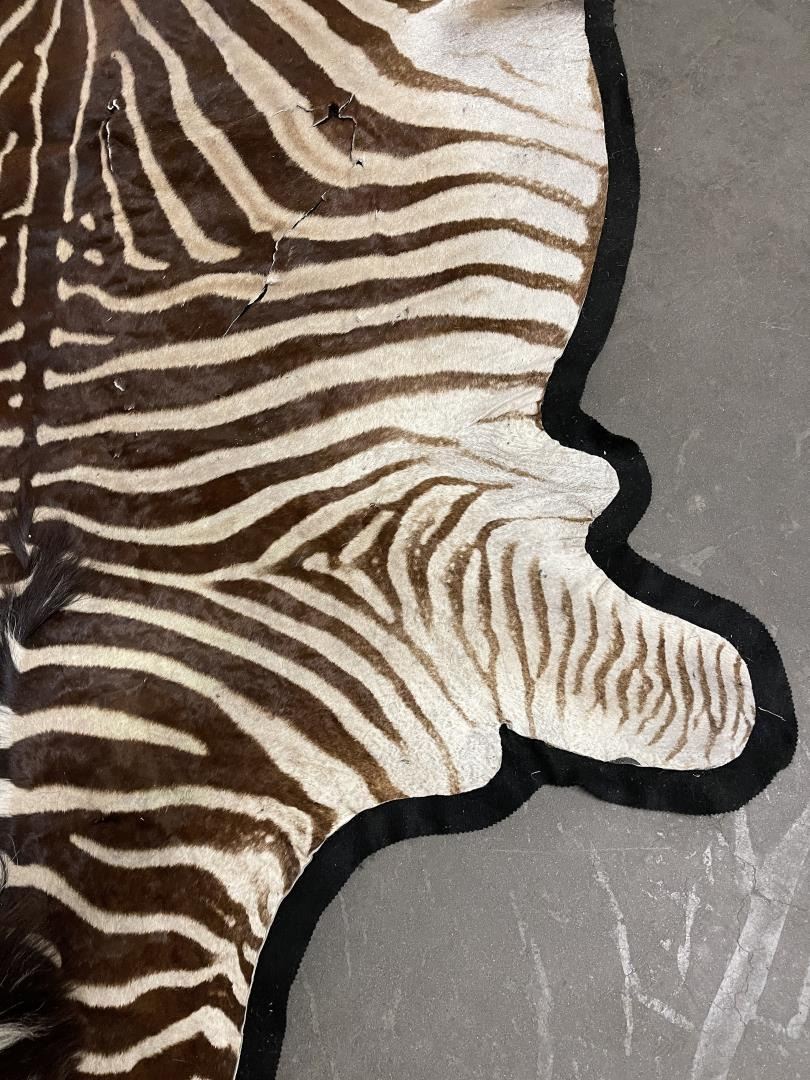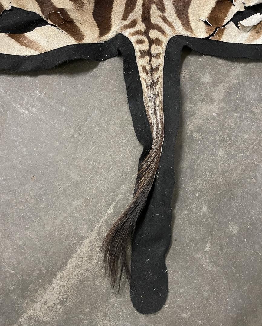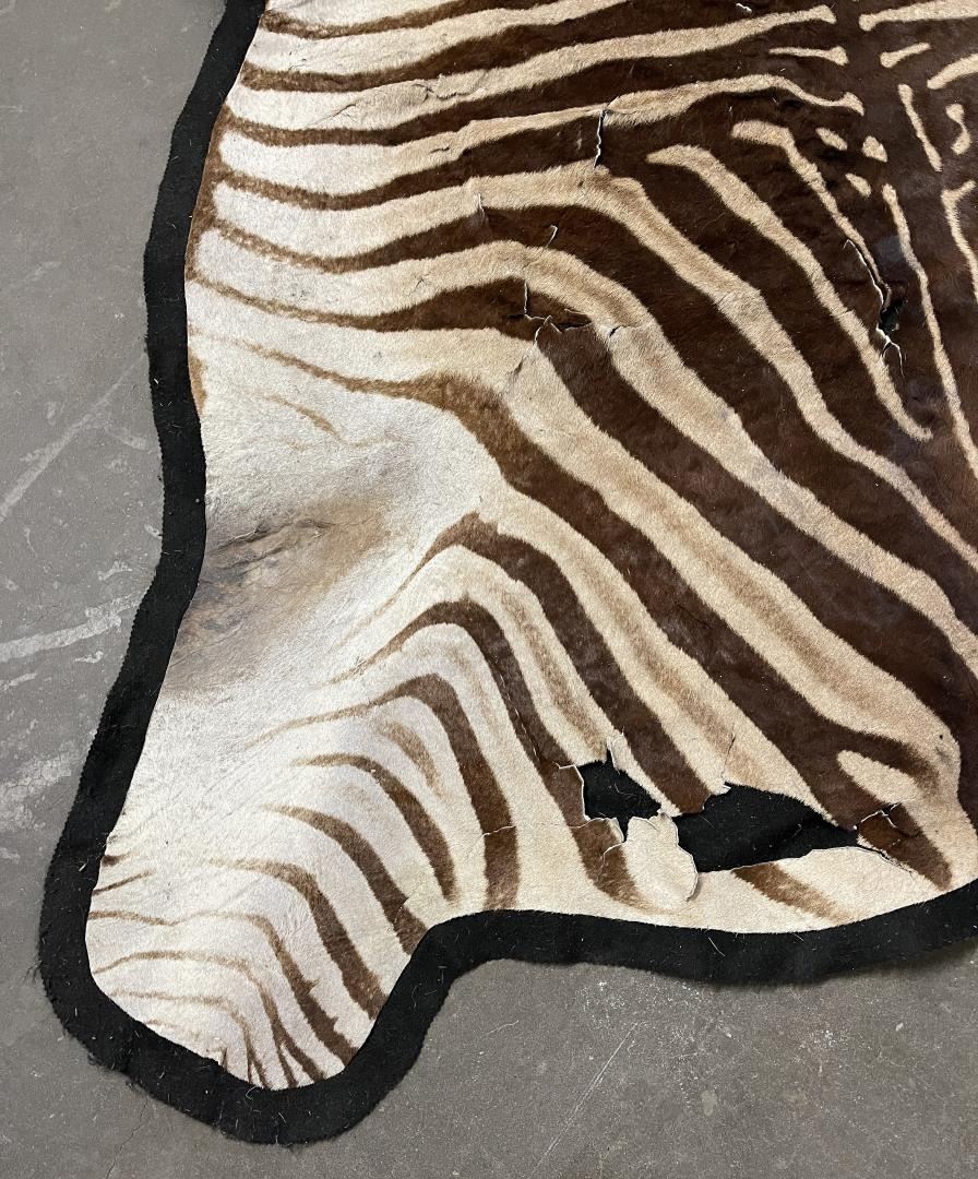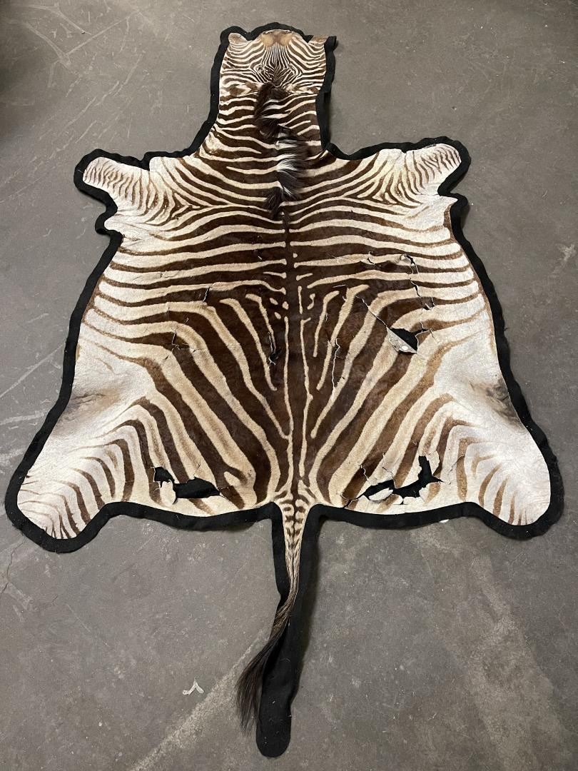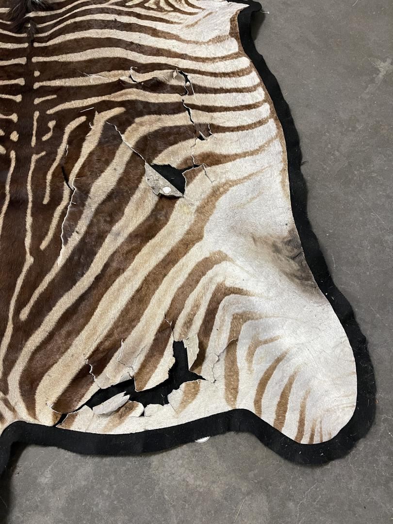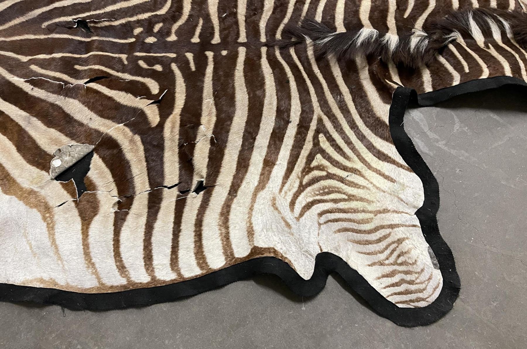Rug has quite a bit of loss and damage as shown. Could be displayed as-is, could also be used for crafts. 124" nose to tail, 64" wide. Legally taken in Africa, not an endangered species. No sales to California for this item.