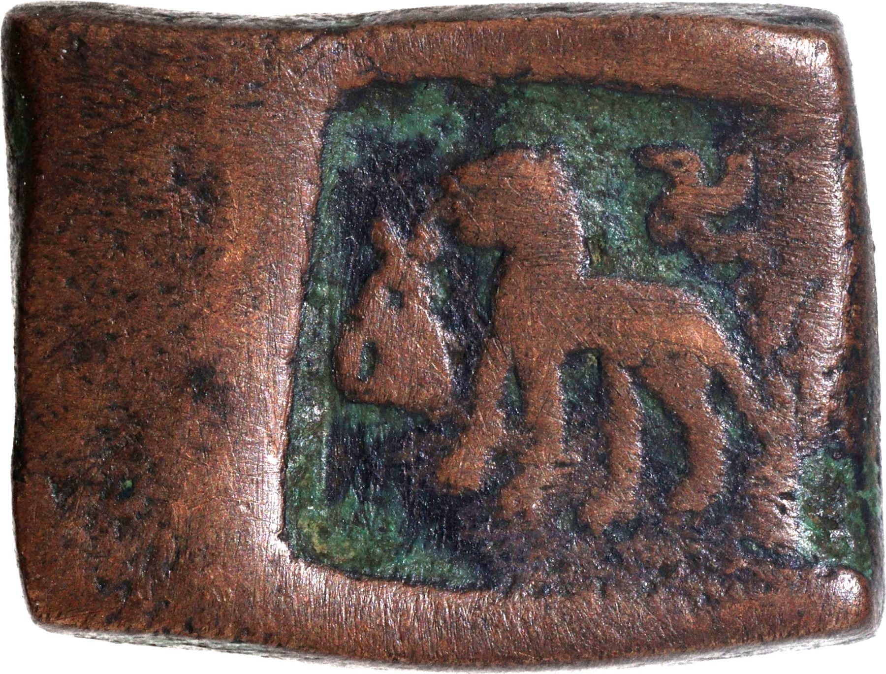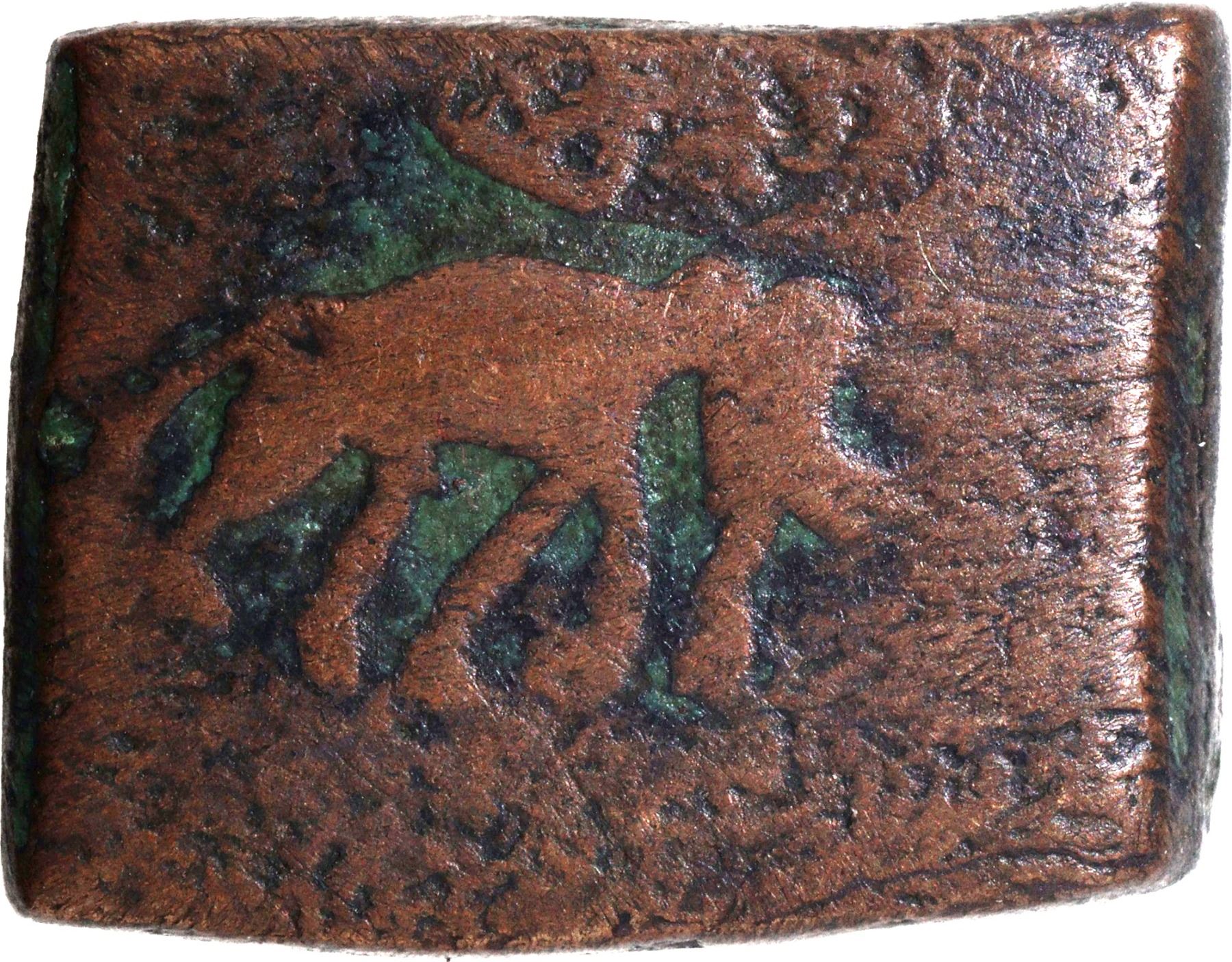 Post Mauryas, Taxila Region (185-160 BC), Square Copper Karshapana, Obv: a lion standing facing left, a Swastika above and a three-arched hill with a crescent in front of it, Rev: an elephant walking to the right, a three-arched hill above, 12.39g, 22.35x17.40mm, (Mitch. ACW # 4392), choice very fine, Scarce.