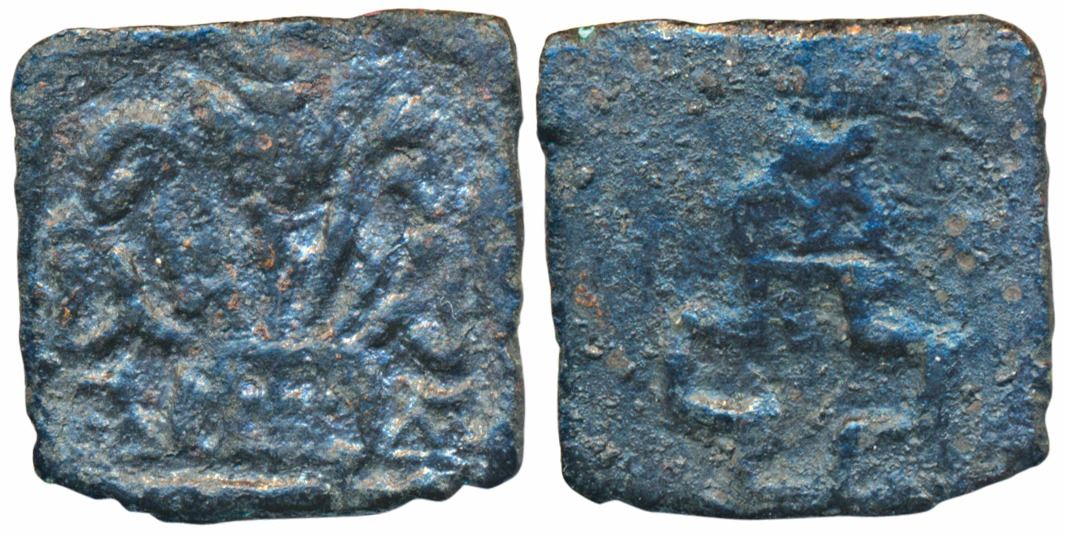 Taxila (local coinage) (c. 200 BC), Copper Karshapana, 3.94g, obv. a lotus standard flanked by two small three arched hill symbols at the base, rev. three arched hill with crescent and hollow cross (Mitch 4418). Fine+.