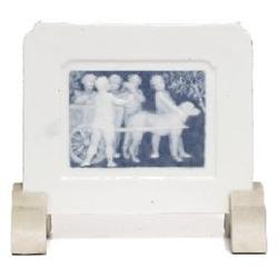 Taxile Doat plaque, footed form in ivory with cameo scenes in white and pink against a blue ground on each side, signed DOAT 1907 Sévres, 6.5”w x 6”h, minute flakes to edges