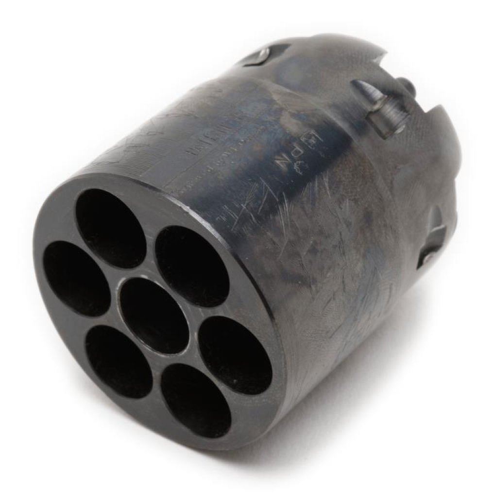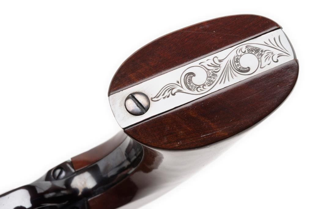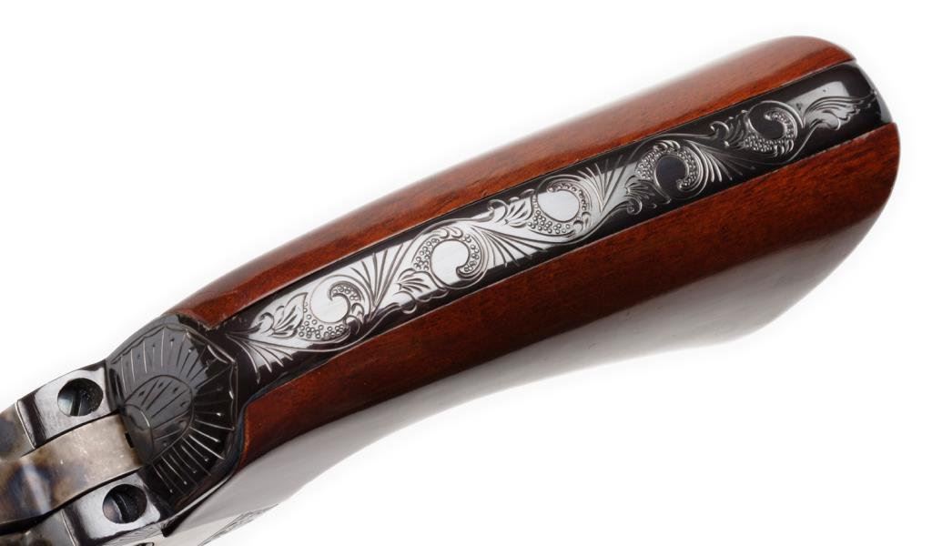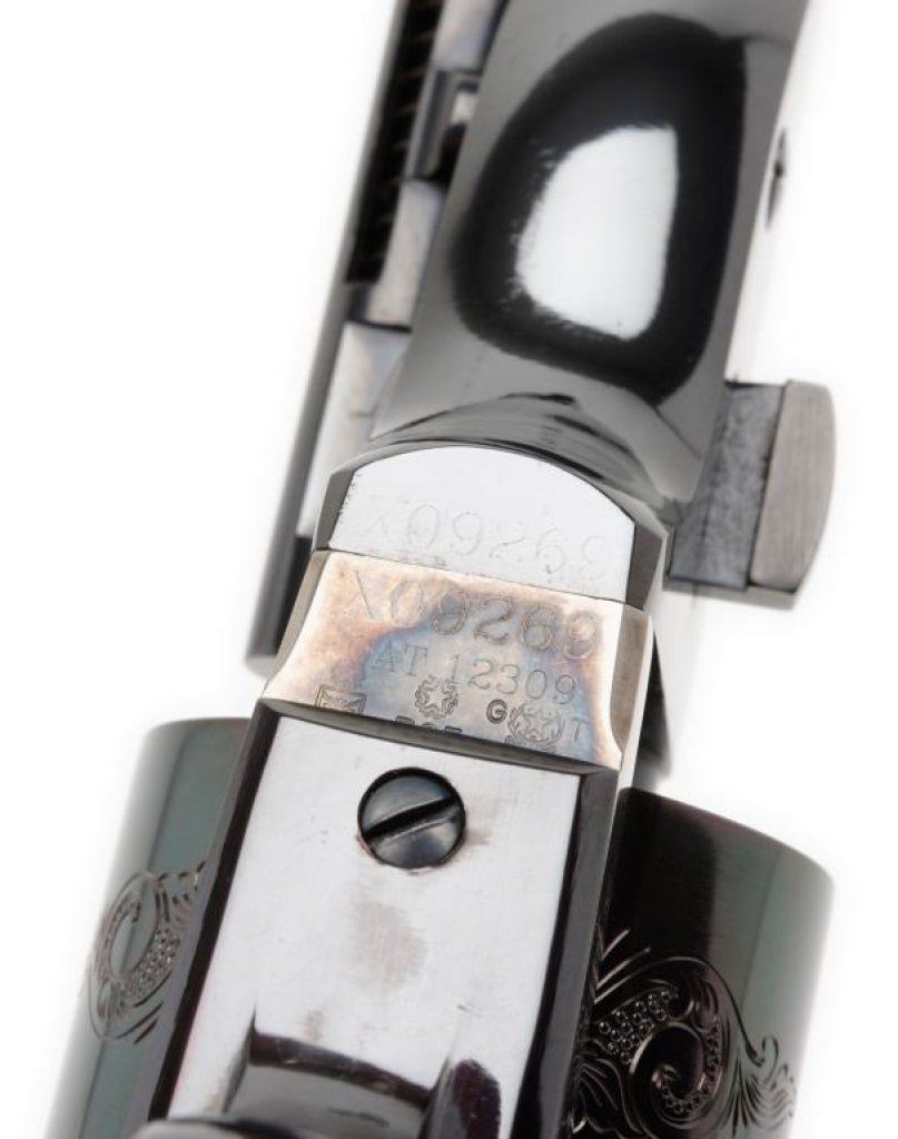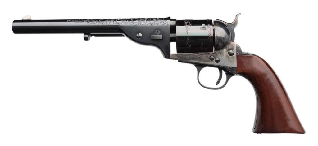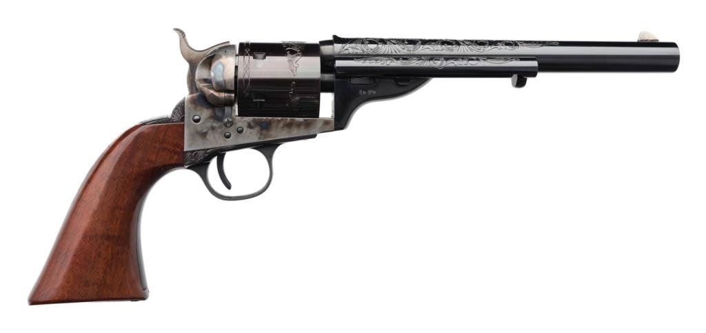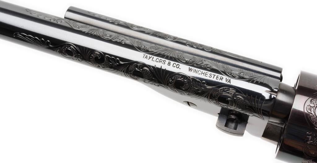 ++Taylor’s & Co.-marked Italian made copy of a Colt Model 1872 Open Top revolver, custom engraved by noted engraver Jim Downing, .45LC caliber, 7.5” barrel, S/N X09269, blued and case hardened finish, smooth wood grips. This gun is in like new condition as customized showing little handling. Also included is a .44 caliber percussion cylinder in like new condition. Accompanied by a color photo and Certificate from Downing. Est.: $750-$1,500.