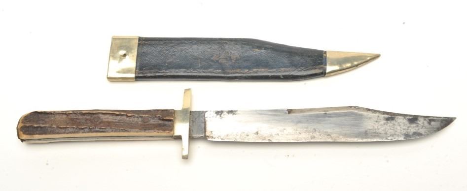 condition showing radical clip and German silver mounts stag grip. Measures 12 ¾” overall with 7 ¾” blade. Very good condition with full dimensions to the blade and most original polish with some minor pitting. Marked at ricasso with “Eye” and “Witness”. The original scabbard is also good to very good missing button for hanging. Est.: $800-$1600
