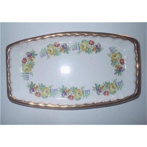 </font></strong>From Taylor & Kent, England in the "Elizabethan" pattern. Fine Bone China with the outer edges trimmed in gold. Pretty floral pattern of bunches of open yellow and purple roses, pansies of yellow and purple, lavender bluebells and soft green leaves on a white background. Excellent condition, no chips, cracks or crazing and no loss or rubbing to the gold trim. Measures 6-1/2" wide from east to west and 3-3/4" from north to south and stands about 1/2" inch in height. </font>