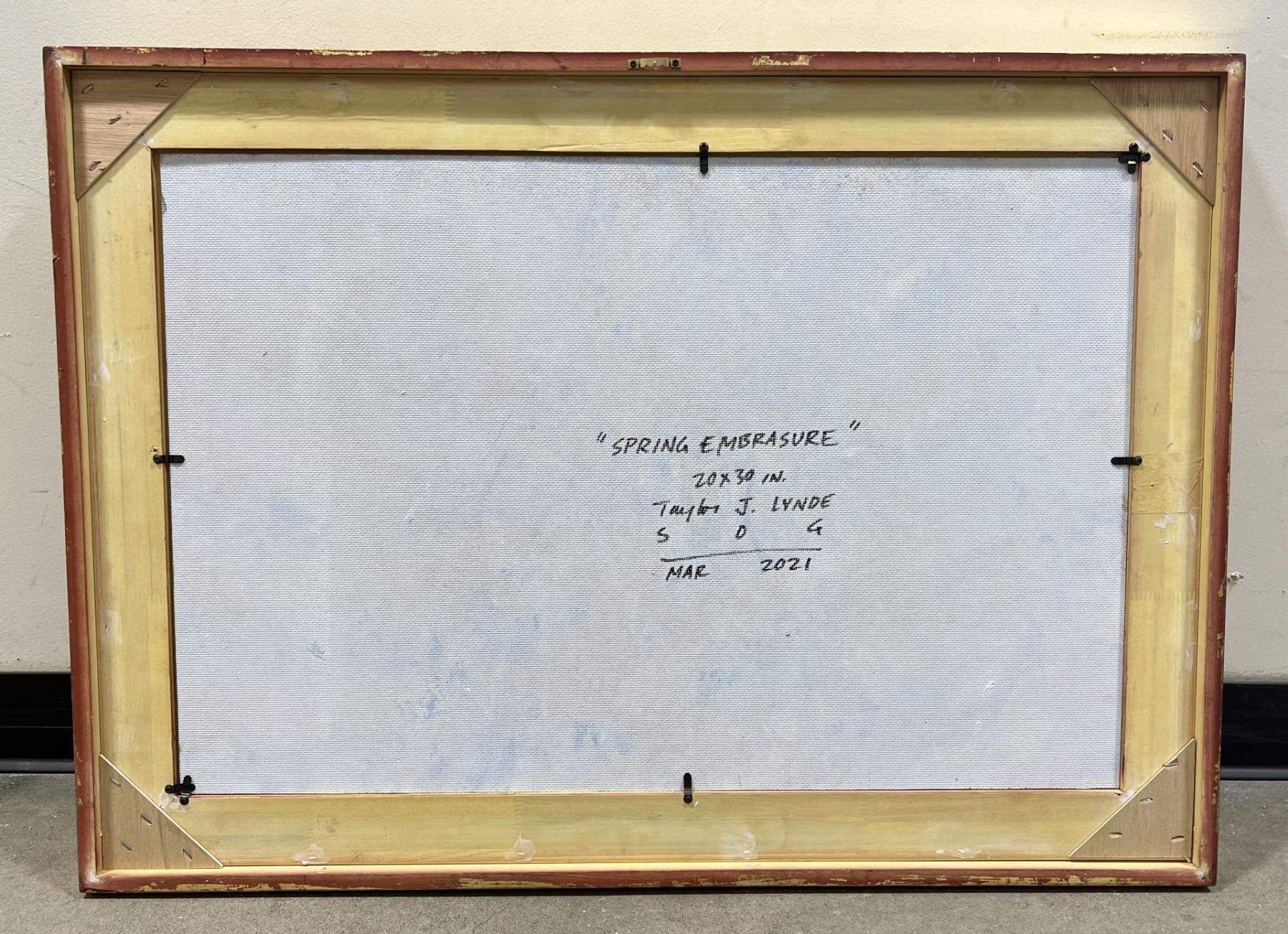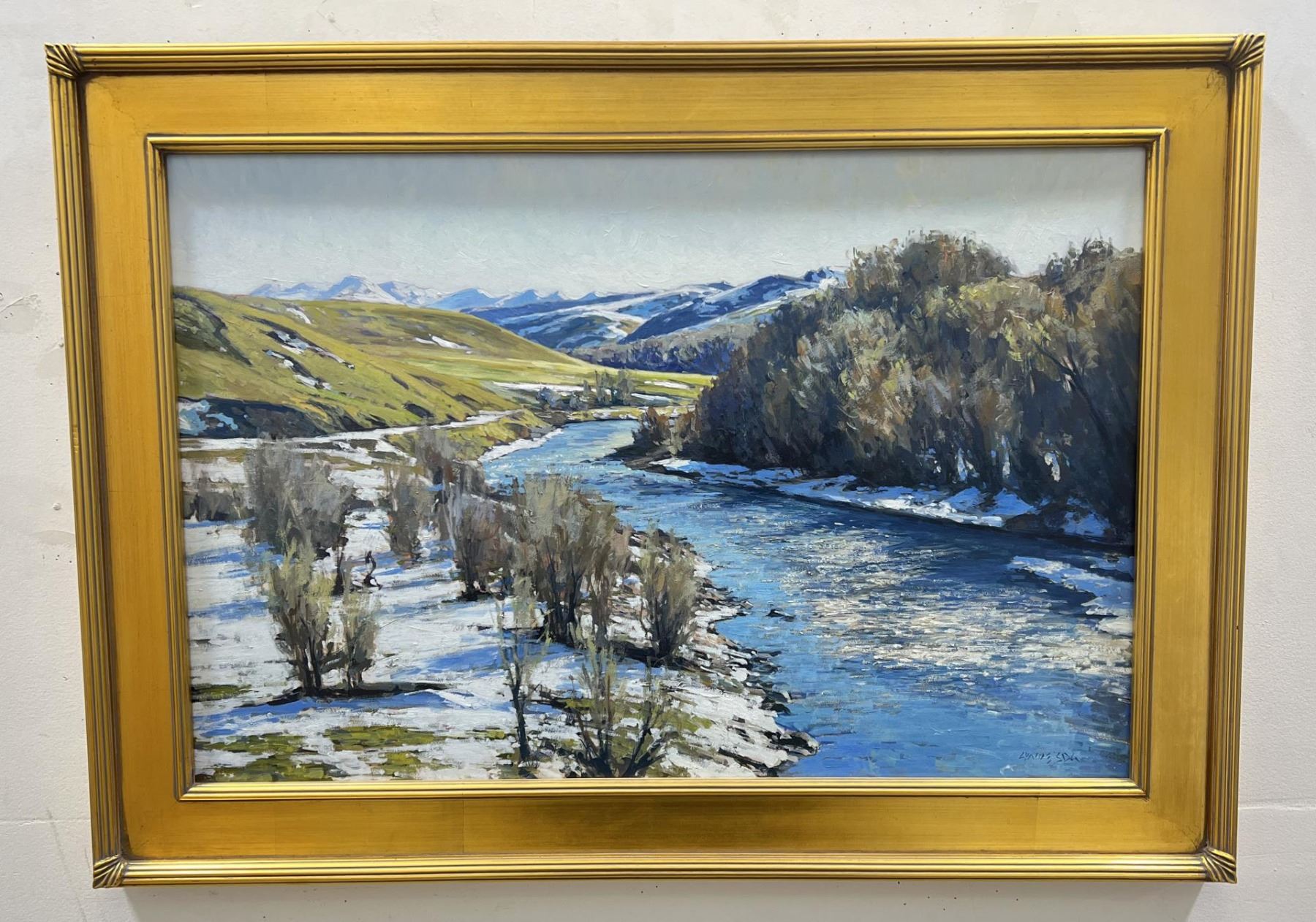 Oil on board. Title is Spring Embrasure. 20" by 30" unframed. 26" by 36" framed. This painting hung prominently in our front office. Taylor Lynde is a fourth generation resident of Montana. His career has been influenced by two men, artist Scott Switzer and his high school art teacher, Michael Kosorok. Besides teaching Lynde the art of oil painting Kosorok also helped him to win a partial scholarship to the Pratt Institute in New York where he spent a year studying drawing and art history. After a year in New York Lynde joined the Navy and served in Desert Shield. He returned to Montana in 1995. He was encouraged again by Switzer who supported him in exchange for Lynde making frames for him. Switzer mentored Lynde for two years and introduced him to his first gallery. Lynde's impressionistic style captures the honest beauty of his subjects.