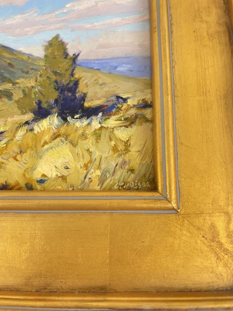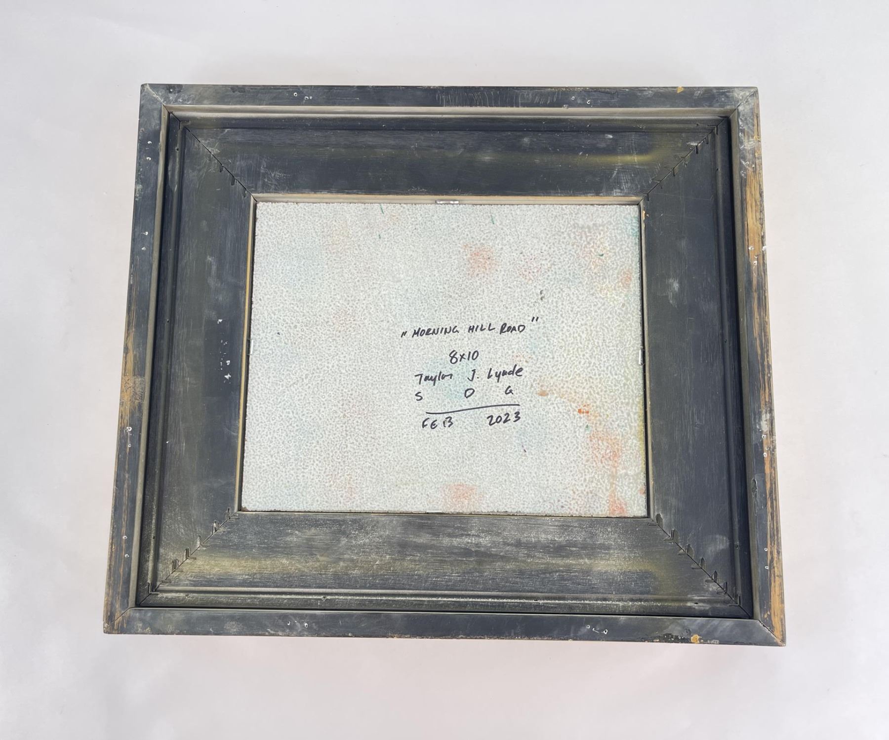 Title is Morning Hill Road. 8" by 10" unframed, 14" by 16" framed. Taylor Lynde is a fourth generation resident of Montana. His career has been influenced by two men, artist Scott Switzer and his high school art teacher, Michael Kosorok. Besides teaching Lynde the art of oil painting Kosorok also helped him to win a partial scholarship to the Pratt Institute in New York where he spent a year studying drawing and art history. After a year in New York Lynde joined the Navy and served in Desert Shield. He returned to Montana in 1995. He was encouraged again by Switzer who supported him in exchange for Lynde making frames for him. Switzer mentored Lynde for two years and introduced him to his first gallery. Lynde's impressionistic style captures the honest beauty of his subjects.
