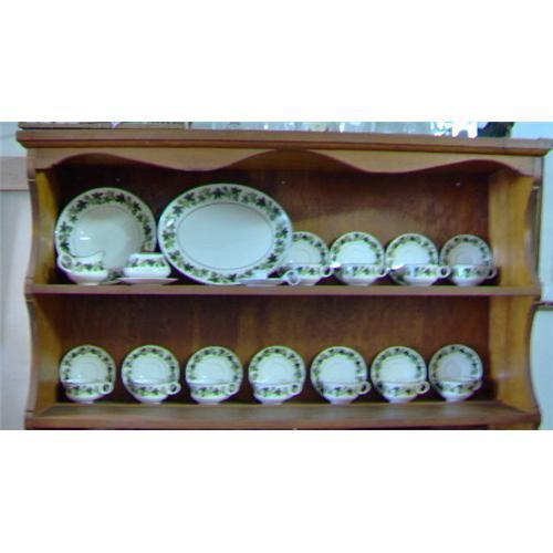 This assortment of the Greenbriar pattern includes 11 sets of cups and saucers, a 12th saucer, an oval serving platter, a serving bowl, and a creamer and covered sugar--28 pieces in all. All items are in nearly mint condition. These would, of course, complete any collection of this pattern. As well, they would look stunning with a white dinner service.<p>
