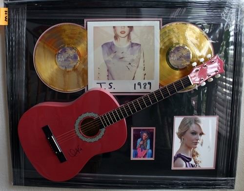 Giclee of Taylor Swift. Gold plated records. Photographs of Taylor Swift. Taylor Swift's signature is lazer matted on the guitar. Beautifully framed one of a kind piece. Dimensions approx 30 x 22