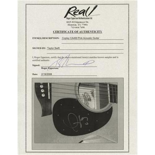 <B>Taylor Swift Signed Guitar.</B></I> A pink Copley CA400 acoustic guitar with a Taylor Swift logo on the body, signed on the pick guard by the singer-songwriter in light blue felt tip. In Excellent condition. <I> Accompanied by a COA from Roger Epperson Authentication LTD.</B></I><BR><BR><b>Shipping:</b> Musical Instruments, Large (<a target="_blank" href="http://www.heritageauctions.com/common/shipping.php">view shipping information</a>)