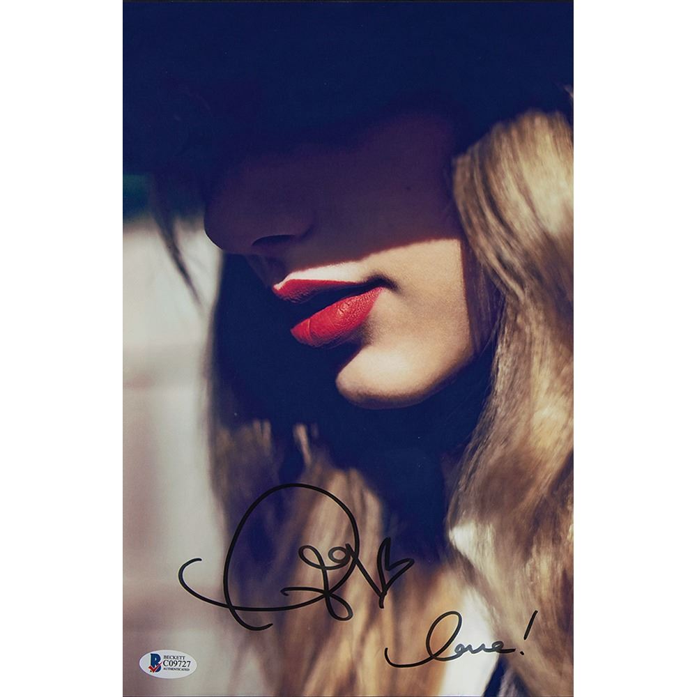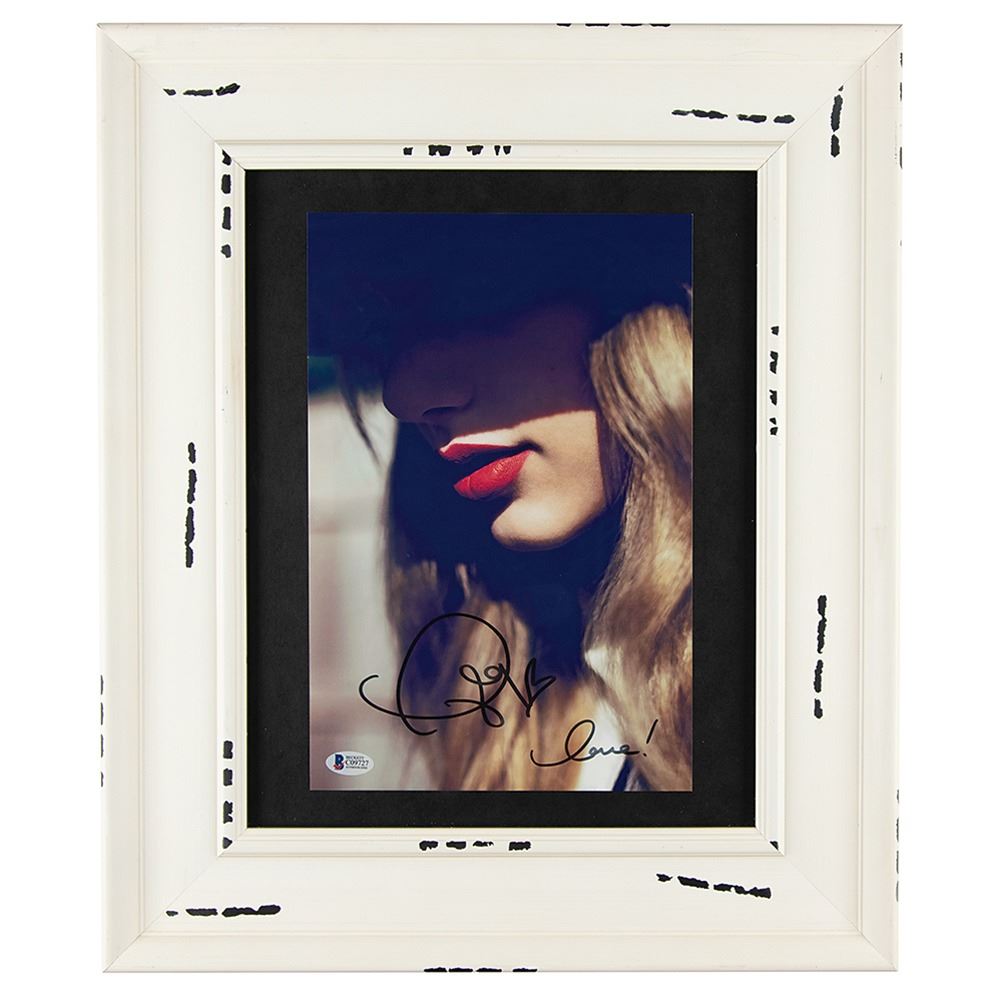 Fabulous color satin-finish 8 x 12 close-up photo from the original Red album cover, signed in black felt tip by Taylor Swift, adding "love!" and a small heart sketch. Mounted and framed to an overall size of 16.5 x 19.5. In fine condition, with a Beckett label affixed to the lower right corner. Accompanied by a certificate of authenticity from Beckett Authentication Services.