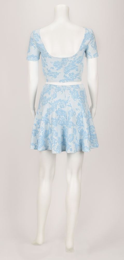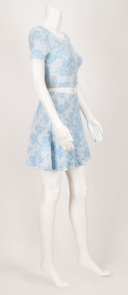 Taylor Swift's personally-worn blue two-piece outfit, consisting of a blue floral-patterned crop top and matching high-waisted skirt, worn out on a date with Calvin Harris in New York City on May 26, 2015. The short-sleeved crop top has a wide, scooping neckline, and the skirt has an elastic waistband; designer's tags have been removed, but the skirt has a tag denoting style, cut, and size. Swift was photographed wearing this outfit outside the East Village's L'asso restaurant; E! News reported that she and Harris ordered a salad and two gluten-free pizzas. In fine condition. Accompanied by a certificate of authenticity from L.A. Archives, in part: "This two-piece blue outfit was worn by Taylor Swift. The outfit came from a stylist who worked for Taylor and had the piece in their possession and later resold it."