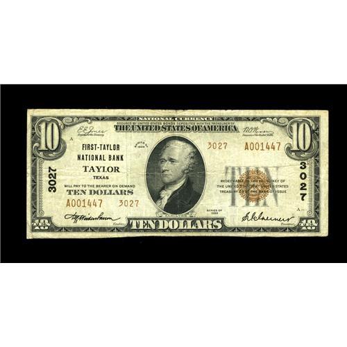 <B>Taylor, TX</B></I> - $10 1929 Ty. 2 <B>First Taylor NB</B></I> Ch. # 3027<BR>This is a very significant note from here, as it is the only Type 2 and the only non-high denomination example known from this institution. <B>Very Fine.</B></I>