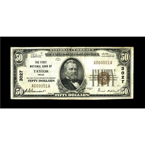 <B>Taylor, TX</B></I> - $50 1929 Ty. 1 <B>The First NB</B></I> Ch. # 3027<BR>High denominations only in small size using this title, with this attractive example one of the nicest known. <B>Very Fine-Extremely Fine.</B></I><BR><BR><b>Shipping:</b> Coin/Currency (<a target="_blank" href="http://www.heritageauctions.com/common/shipping.php">view shipping information</a>)