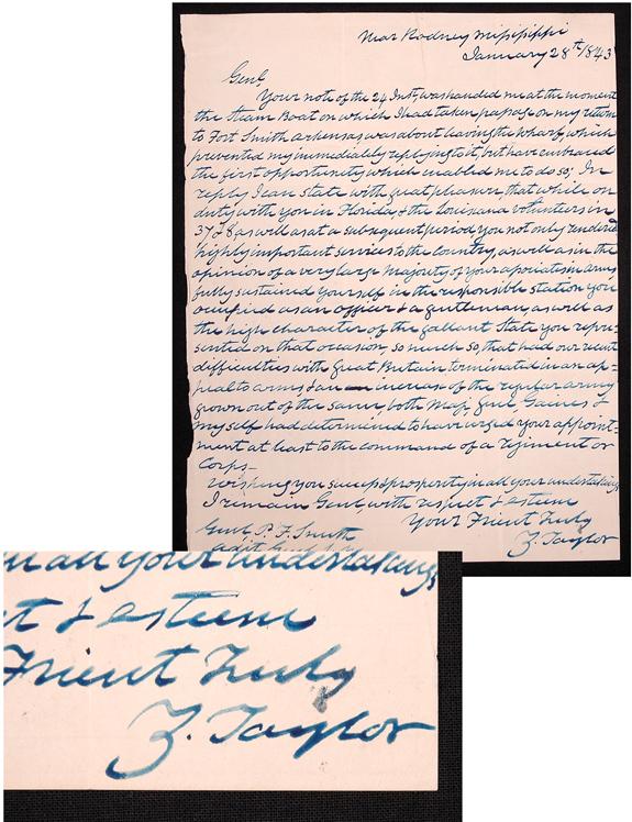 Taylor, Zachary (1784-1850) 12th President of the United States (1849-18500. Autograph letter signed ("Z. Taylor") 1 page, 10 x 8", "Near Rodney Mississippi," Jan. 28, 1843. A letter of commendation to General Persifer F. Smith, praising Smith's service in the Second Seminole War (1835-1842). "…I can state with great pleasure, that while on duty with you in Florida, & the Louisiana volunteers in 37 & 8…you not only rendered highly important services to the country, as well as in the opinion of a very large majority of your associates in arms, fully sustained yourself in the responsible station you occupied as an officer & a gentleman, as well as the high character of the gallant State you represented on that occasion, so much so, that had our recent difficulties with Great Britain terminated in an appeal to arms…both Majr. Genl. Gaines & myself had determined to have urged your appointment at least to the command of a regiment or corps…." Left margin is slightly uneven. Boldly penned and signed in blue ink.
