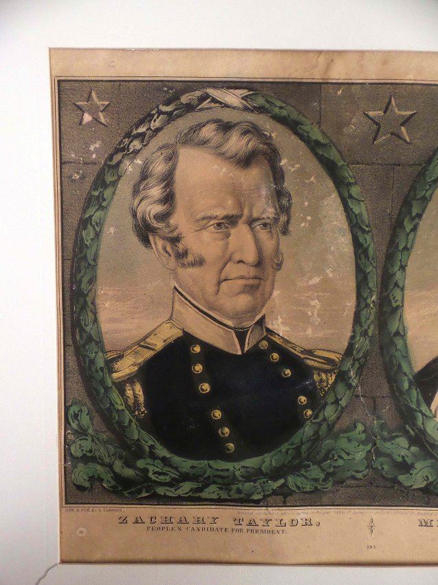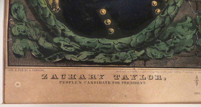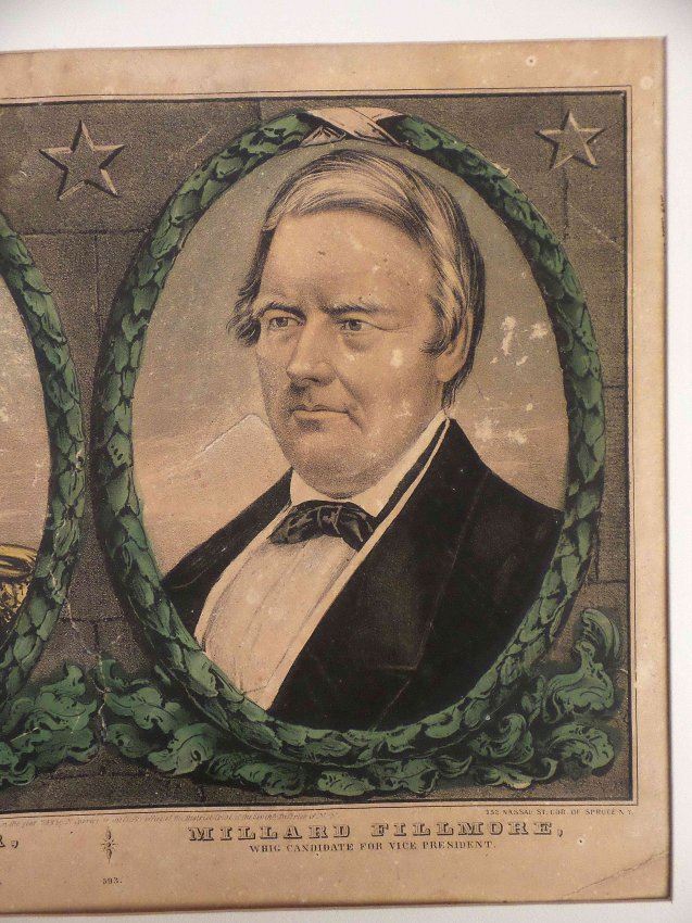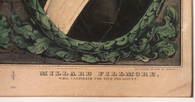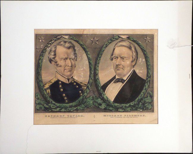 Hand-colored lithograph by Nathaniel Currier, 1848. Depicts opposing portraits of Taylor and Fillmore as candidates for president and vice-president of the Whig Party [Image: 8-3/4" H x 12-1/2" W on larger sheet]. Age toning, surface abrasions, and repaired tear. Margin defects include short tears and chipping with losses.