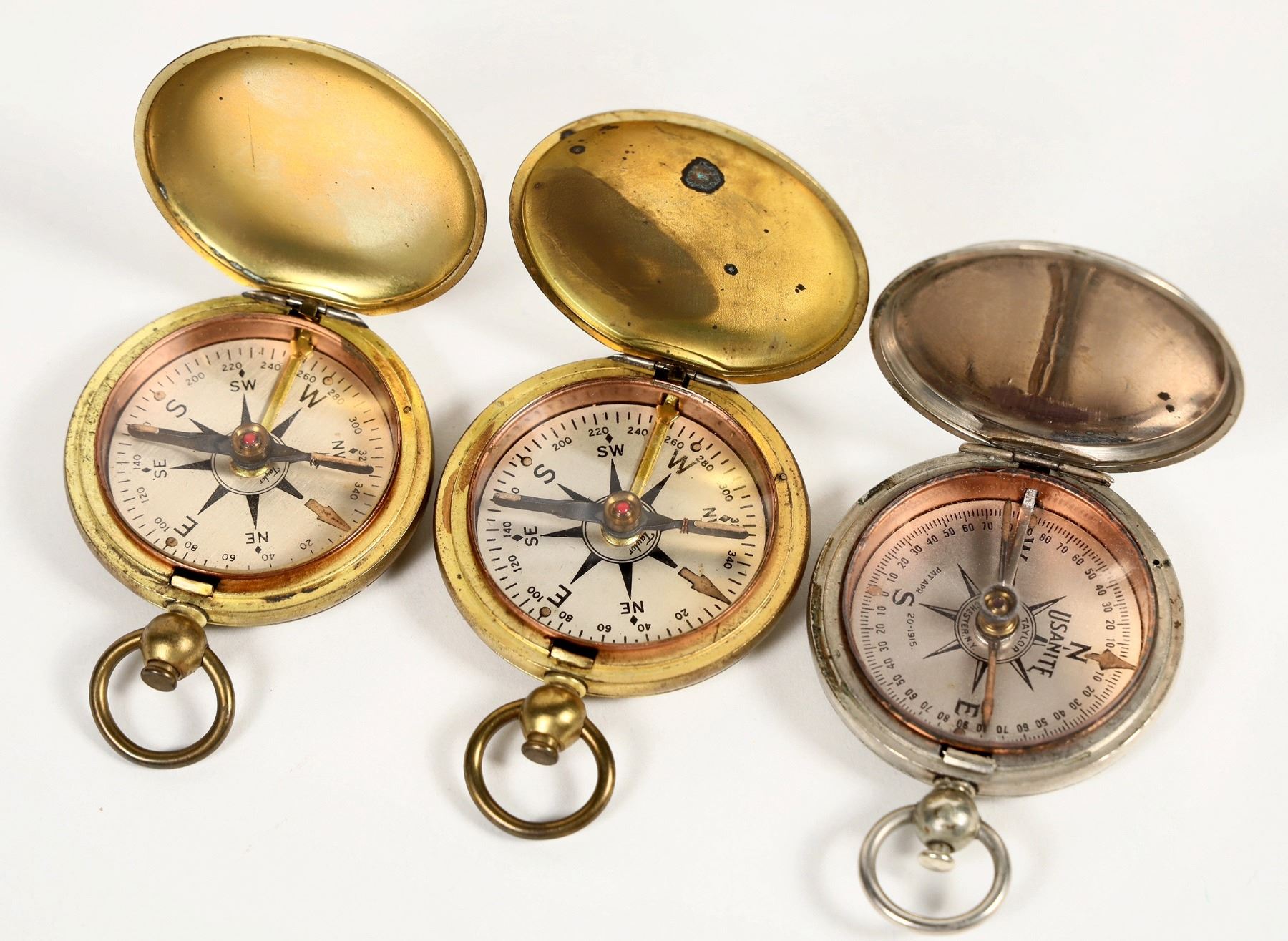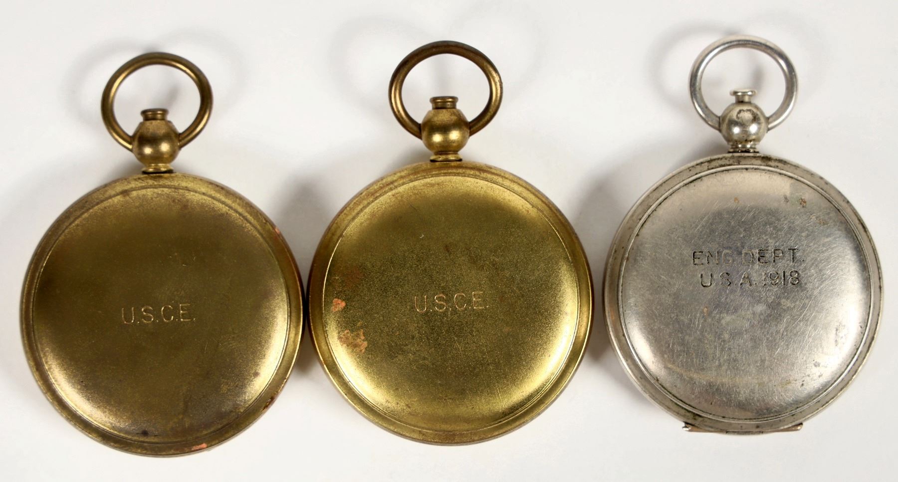 This collection of three compasses were issued to the USCE (United States Corp. of Engineers) engraved on the covers. One is marked 1915, issued to Doughboys during WW1. Two are working well, the nickeled compass is non-working. From the Popovich collection. Please see photos for details.