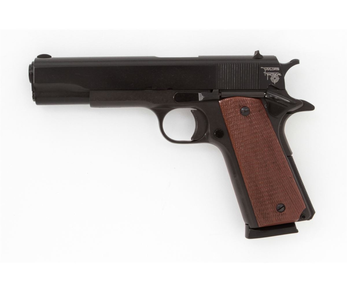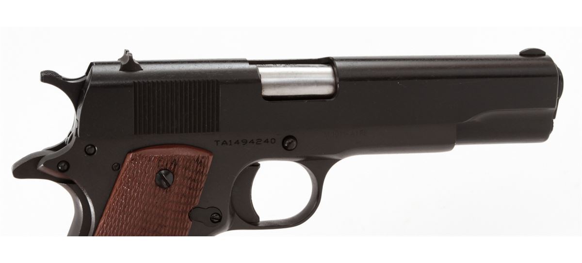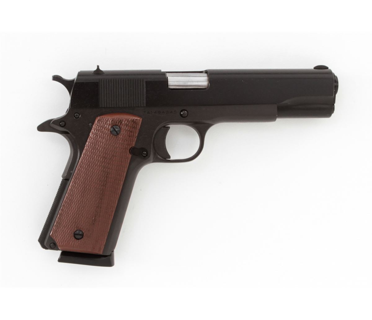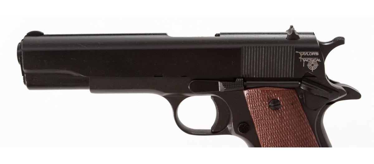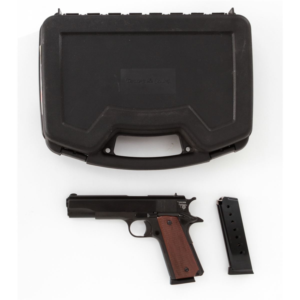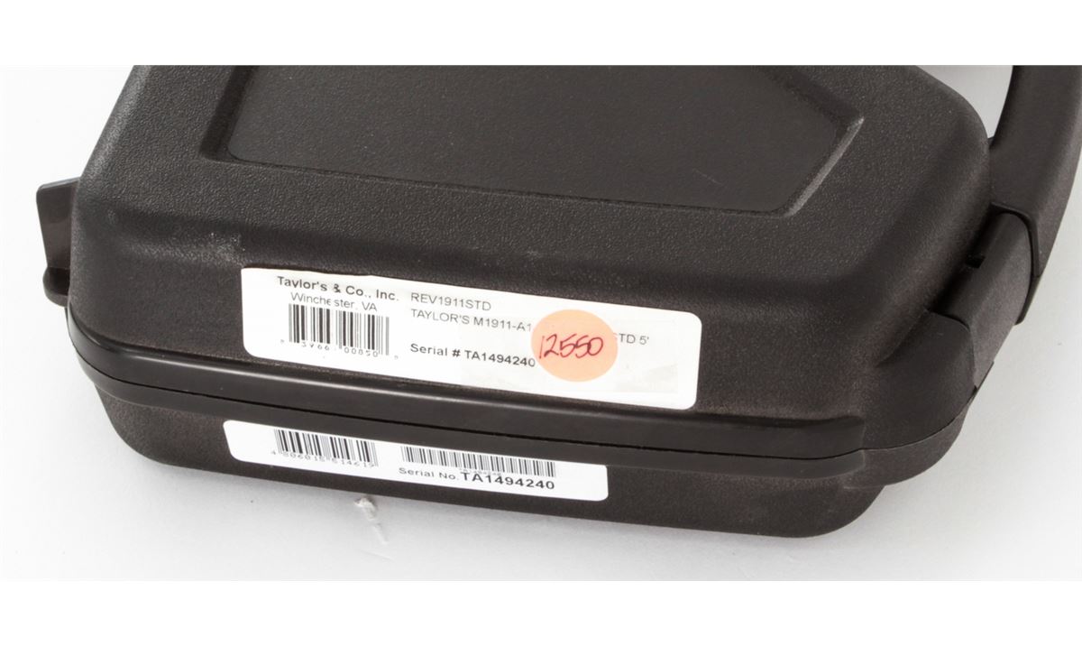 Taylor's & Co. Inc. Model 1911-A1 FS Semi-Automatic Pistol, #TA1494240, .45 ACP cal., 5'' barrel, parkerized finish, checkered wood grips, with two (2) Armscor magazines, in original case with matching end label. Condition is excellent, remaining as new and unfired, with some overall light marks from handling. Retails @ $559.95. Est.: $300-$500. (Modern) (Field Time)(Not available to Calif. residents.)