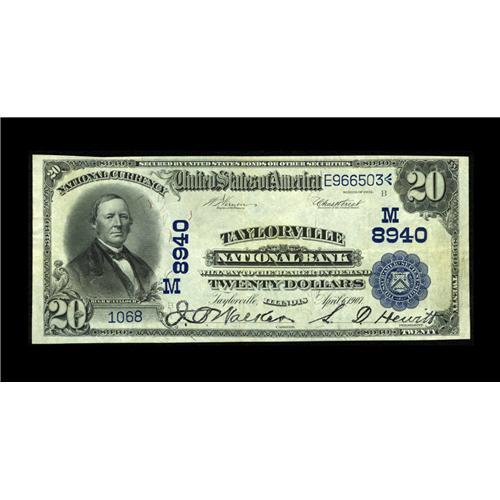 <B>Taylorville, IL</B></I> - $20 1902 Date Back Fr. 644 <B>The Taylorville NB</B></I> Ch. # (M)8940<BR>While almost 40 Large Size notes are listed in the census from here, just one, this <B>Very Fine+++</B></I> example, is a $20 Date Back. The color is bright; the margins broad and well balanced; the stamped signatures are especially strong and there remains considerable crispness and snap to the paper. A premium note that would be right at home in a collection otherwise confined to technically higher grade items.<BR><BR><b>Shipping:</b> Coin/Currency (<a target="_blank" href="http://www.heritageauctions.com/common/shipping.php">view shipping information</a>)