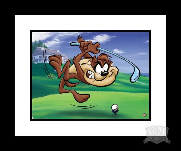Taz Tee Off- A Fine Art Giclee featuring Looney Tunes character the Tazmanian Devil Perfect for any golfer fanatic's room. Limited Edition. Comes matted and framed with Certificate of Authenticity. Size 16x20. Edition Size 500.Looney Tunes is a Warner