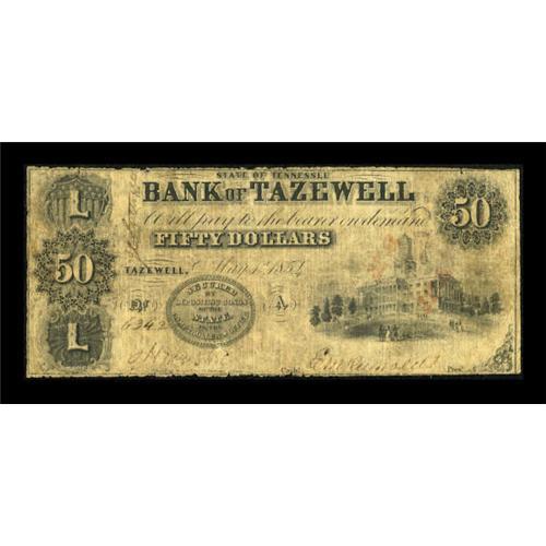 <B>Tazewell, TN- Bank of Tazewell </B></I>$50 May 1, 1854 Garland 1224 G14a<BR> This is one of the great rarities from this state. Three notes are known from this bank, two of which are reputed to be in Tazewell and which have never (and likely will never) be offered to the collecting community, leaving this example as the sole representative from this bank available to collectors. Expect some serious competition before the hammer falls on this lot tonight. <B>Very Good-Fine.</B></I><BR><BR><b>Shipping:</b> Coins & Currency (<a target="_blank" href="http://www.heritageauctions.com/common/shipping.php">view shipping information</a>)