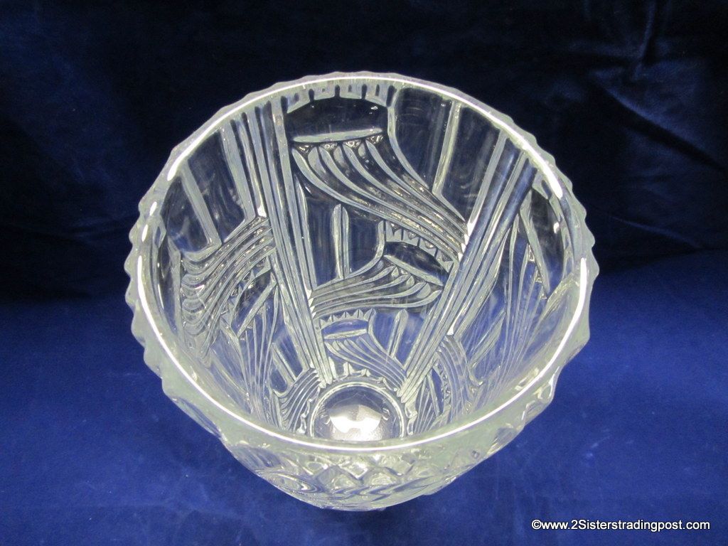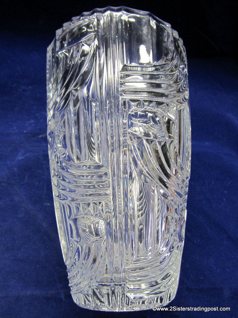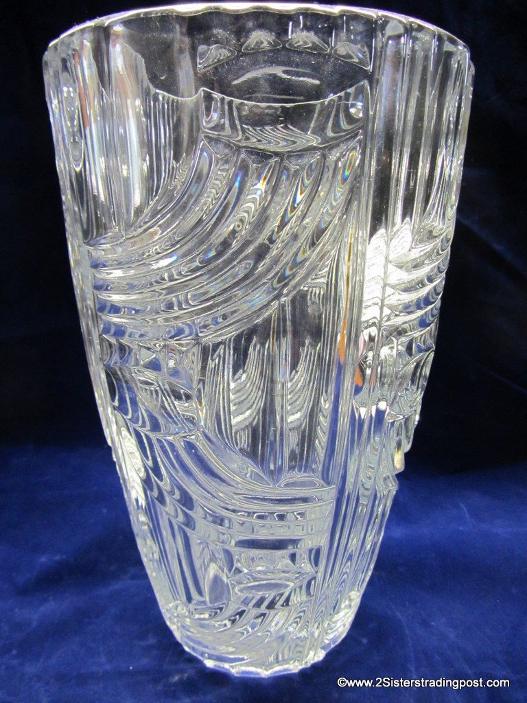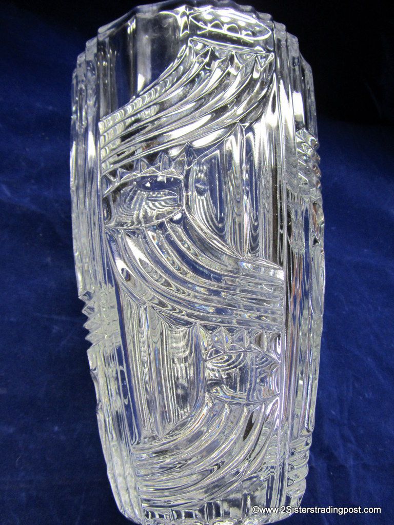 This pressed glass vase is stamped Tchecoslovaquie on the bottom. The vase measures 10 in/255mm tall x 6.5" across top x 3.5" across bottom. The design features a geometric pattern & is a very pretty piece. Research indicates that this piece maybe a Libochovice circa 1950's but no guarantees.