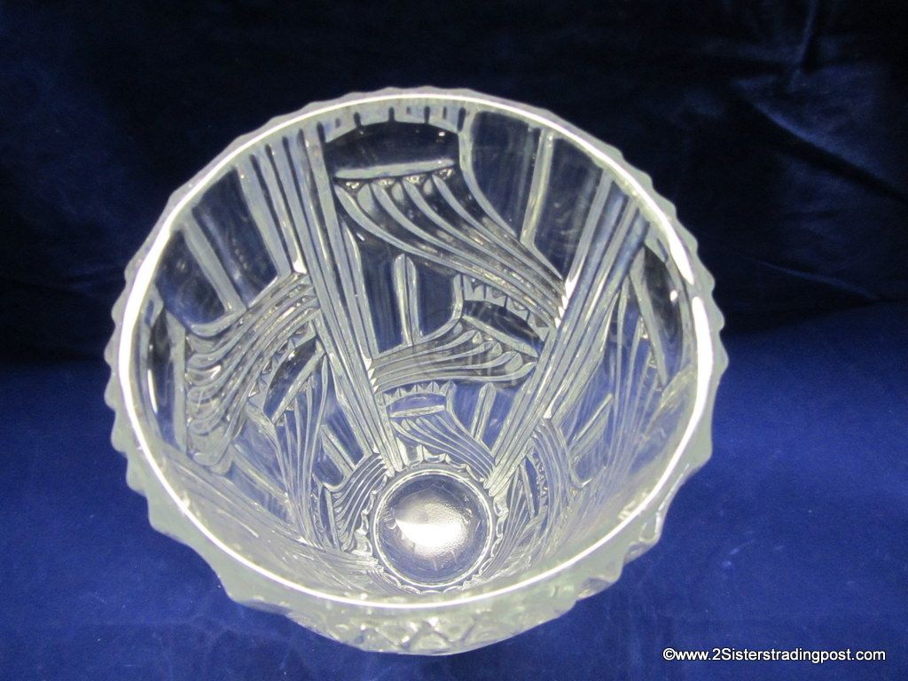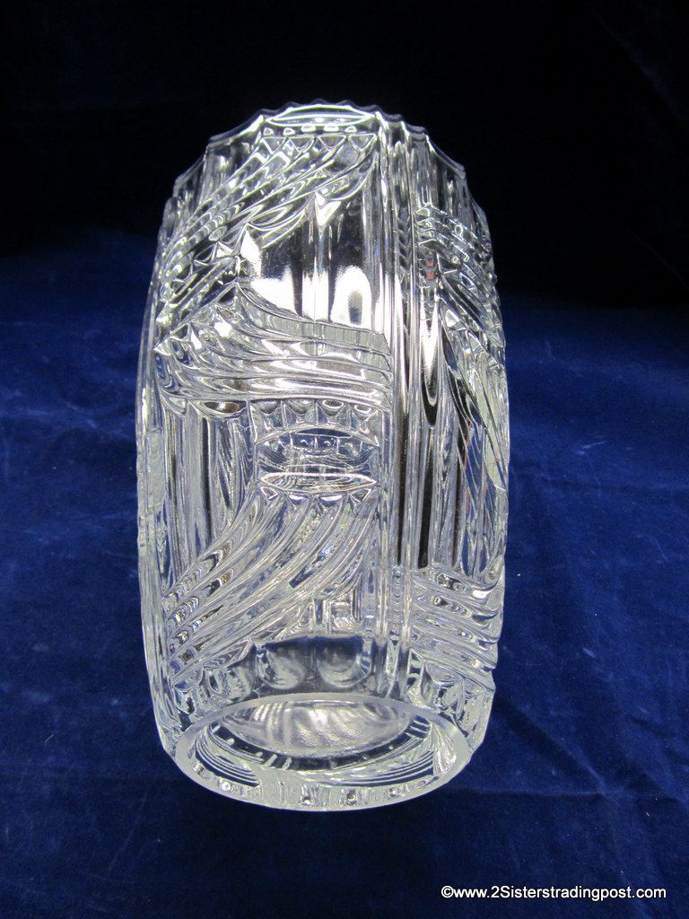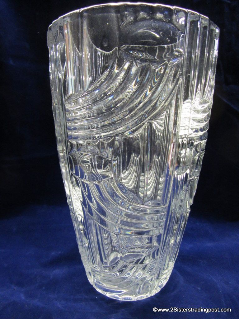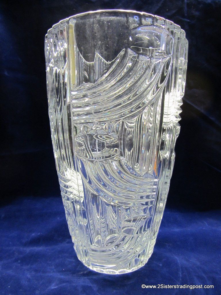 This pressed glass vase is stamped Tchecoslovaquie on the bottom. The vase measures 10 in/255mm tall x 6.5" across top x 3.5" across bottom. The design features a geometric pattern & is a very pretty piece. Research indicates that this piece maybe a Libochovice circa 1950's but no guarantees.