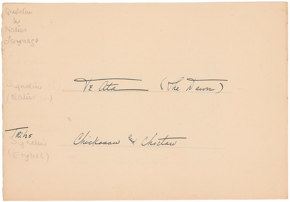 Actress and citizen of the Chickasaw Nation known for telling Native American stories (1895–1995). Vintage fountain pen signature, “Te Ata (The Dawn), Chickasaw and Choctaw,” on an off-white 10 x 7 album page. In fine condition.