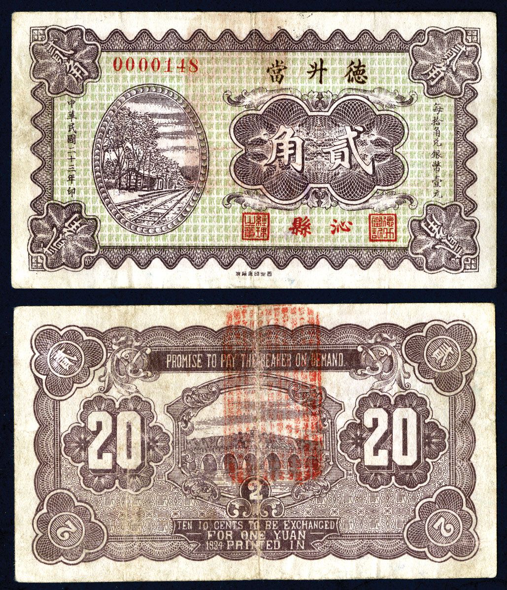 China, 1934, 20 Cents, P-Unlisted, Purple on light green with railroad tracks on left, back purple with bridge with English text "Promise to pay bearer on demand - 10 Cents to be exchanges for 1 Yuan". S/N 0000148, VF condition. Scarce private issue.