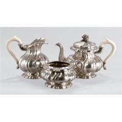 Pest, 19. sz. utolsó harmada, ezüst, hólyagos díszu trébelt test, elefántcsont füllel, belül aranyozva, cukortartó fedél hiányzik, br. 2121,9 g; m: 20 cm